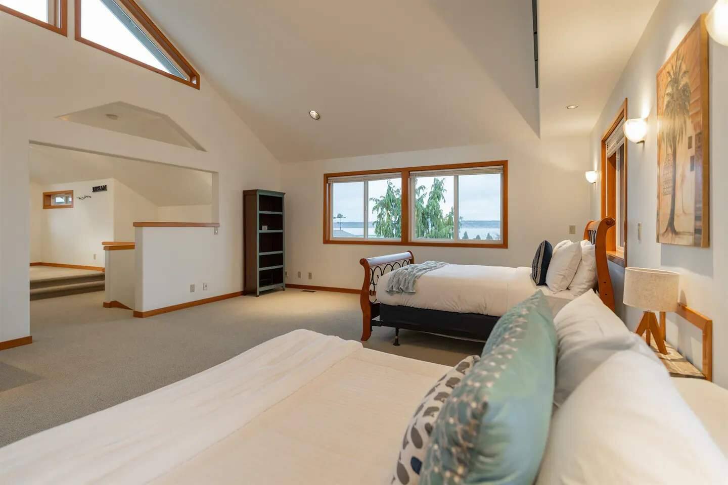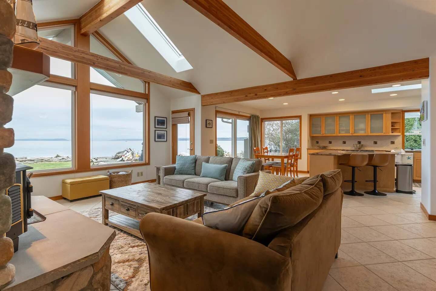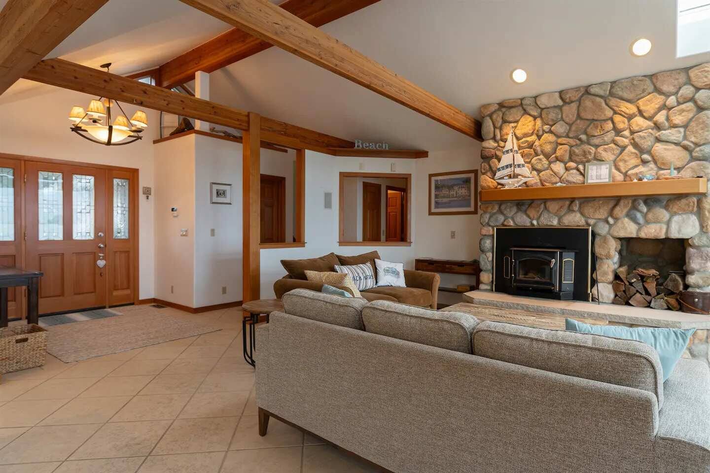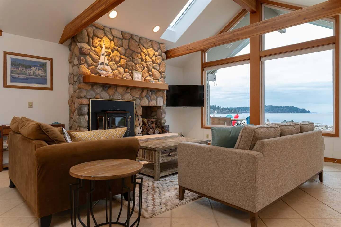 As you step onto Beach Cove's front porch, you'll be greeted by the soothing melodies of wind chimes, setting the stage for a serene coastal experience. Inside, the open common area welcomes you with soaring cathedral ceilings, creating a spacious and airy ambiance perfect for unwinding. ★ Living Room: Relax on plush sofas by the indoor wood fireplace, ideal for cozy evenings. ★ Kitchen: The fully equipped kitchen boasts sparkling granite countertops and sweeping views of Puget Sound. ★ Master Bedroom: Enjoy a king-sized bed with direct backyard access leading to breathtaking waterfront views. It also features a luxurious ensuite bathroom and jacuzzi with Sound vistas. ★ Second Bedroom: A queen-sized bed on the main level ensures comfort for large families or groups of friends. ★ Loft: Venture upstairs and discover a versatile space with two double beds, perfect for activities, work, or quiet contemplation, offering expansive water views. ★ Outdoor Amenities - Dog-Friendly: A designated dog run area on the side of the house. - Fire Pit: Gather around the gas fire pit in the backyard for warmth and camaraderie. - Beach Access: Direct launch for two kayaks and two paddleboards provided for your use. Whether you're seeking a romantic getaway or a family retreat, Beach Cove promises an unforgettable experience where cherished memories are made against the backdrop of the Puget Sound. Book your stay now and let Beach Cove become your sanctuary by the sea. NOTE: Beach fires are prohibited on the premises. No smoking is allowed in the home or on the property, this includes vaping and e-cigarettes.