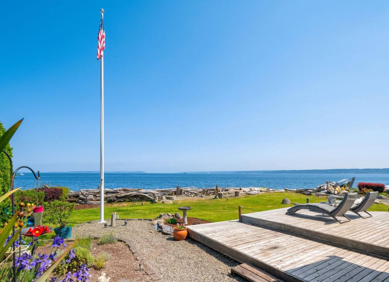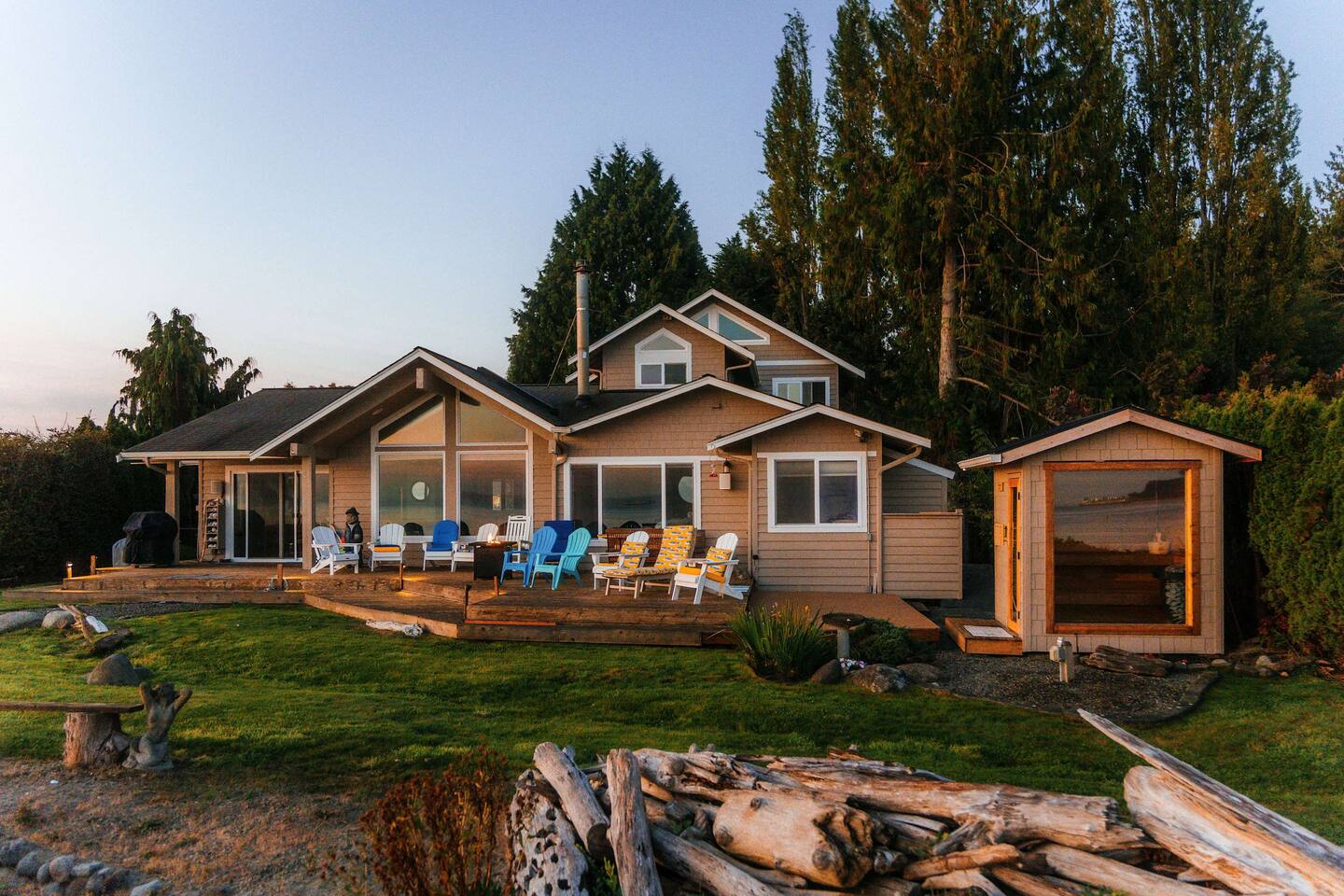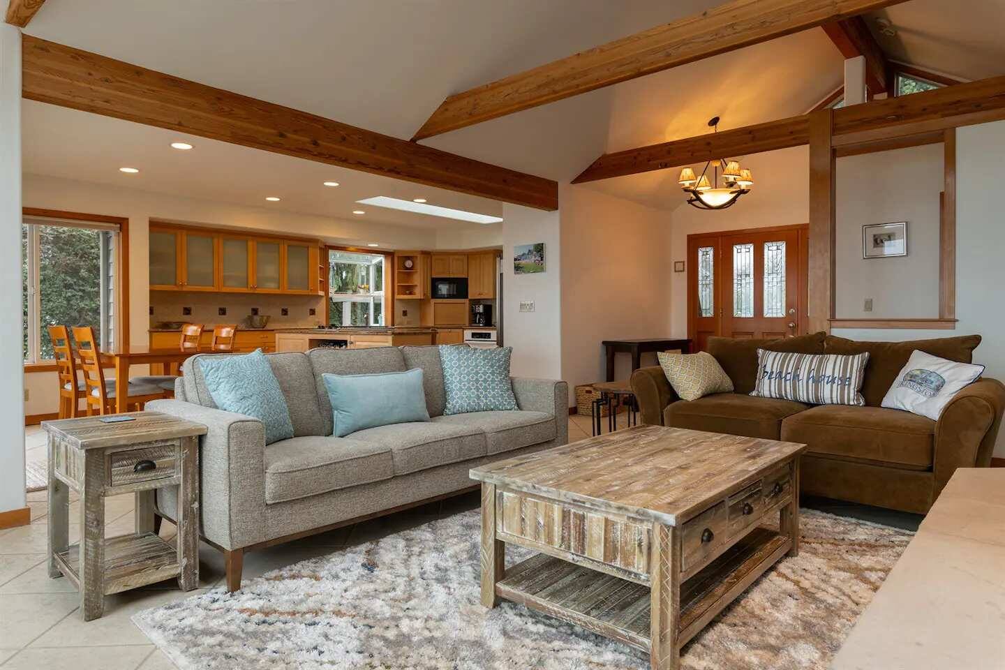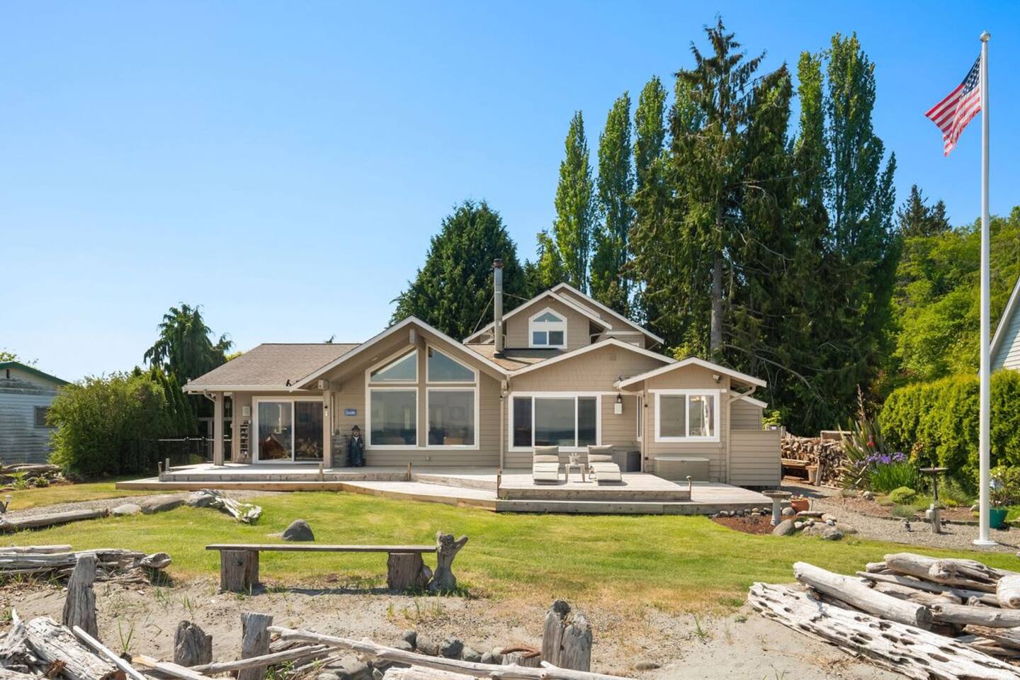 As you step onto Beach Cove's front porch, you'll be greeted by the soothing melodies of wind chimes, setting the stage for a serene coastal experience. Inside, the open common area welcomes you with soaring cathedral ceilings, creating a spacious and airy ambiance perfect for unwinding. ★ Living Room: Relax on plush sofas by the indoor wood fireplace, ideal for cozy evenings. ★ Kitchen: The fully equipped kitchen boasts sparkling granite countertops and sweeping views of Puget Sound. ★ Master Bedroom: Enjoy a king-sized bed with direct backyard access leading to breathtaking waterfront views. It also features a luxurious ensuite bathroom and jacuzzi with Sound vistas. ★ Second Bedroom: A queen-sized bed on the main level ensures comfort for large families or groups of friends. ★ Loft: Venture upstairs and discover a versatile space with two double beds, perfect for activities, work, or quiet contemplation, offering expansive water views. ★ Outdoor Amenities - Dog-Friendly: A designated dog run area on the side of the house. - Fire Pit: Gather around the gas fire pit in the backyard for warmth and camaraderie. - Beach Access: Direct launch for two kayaks and two paddleboards provided for your use. Whether you're seeking a romantic getaway or a family retreat, Beach Cove promises an unforgettable experience where cherished memories are made against the backdrop of the Puget Sound. Book your stay now and let Beach Cove become your sanctuary by the sea. NOTE: Beach fires are prohibited on the premises. No smoking is allowed in the home or on the property, this includes vaping and e-cigarettes.