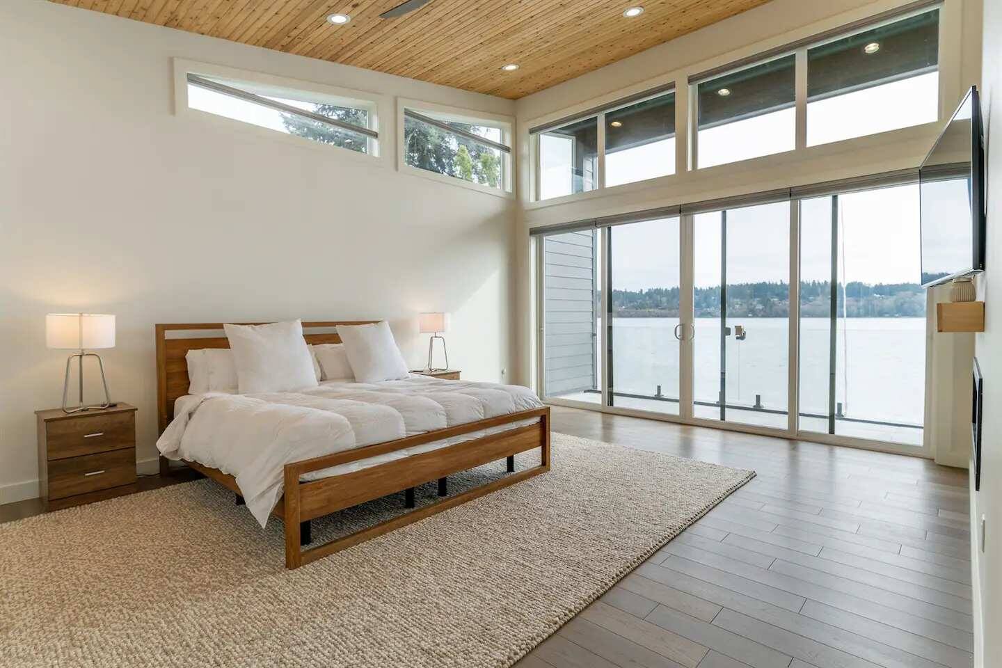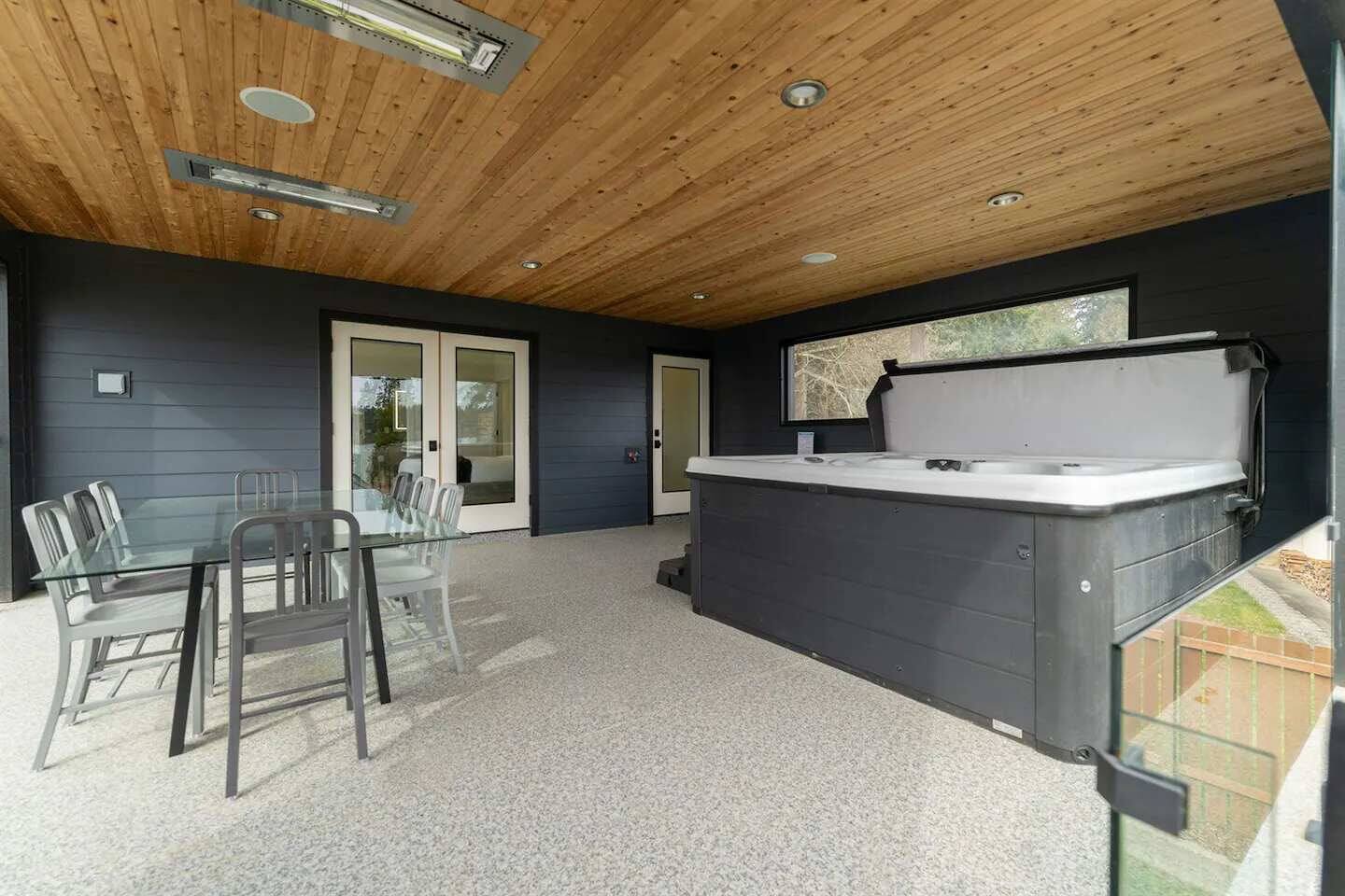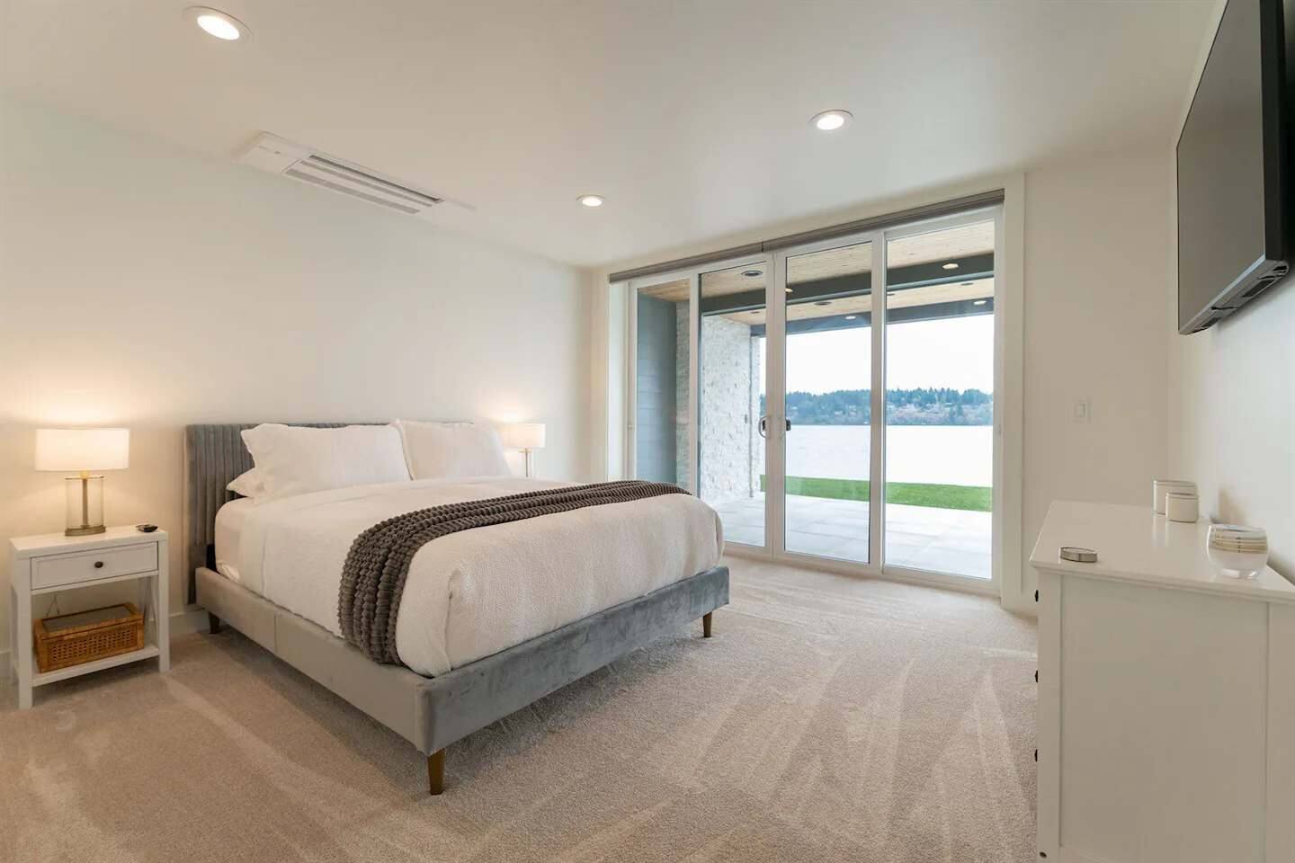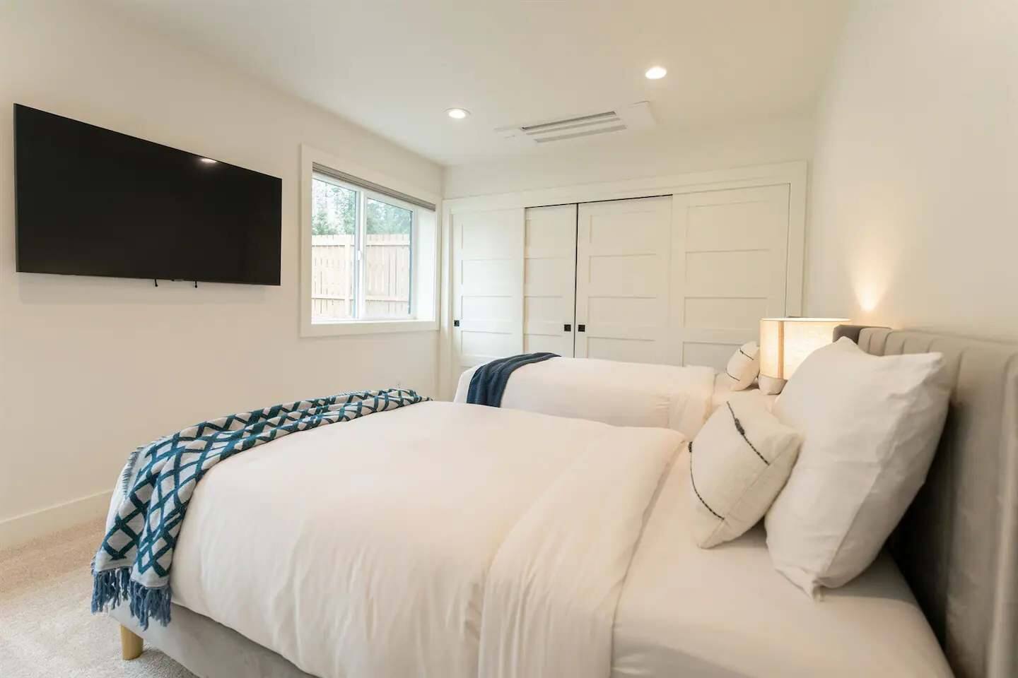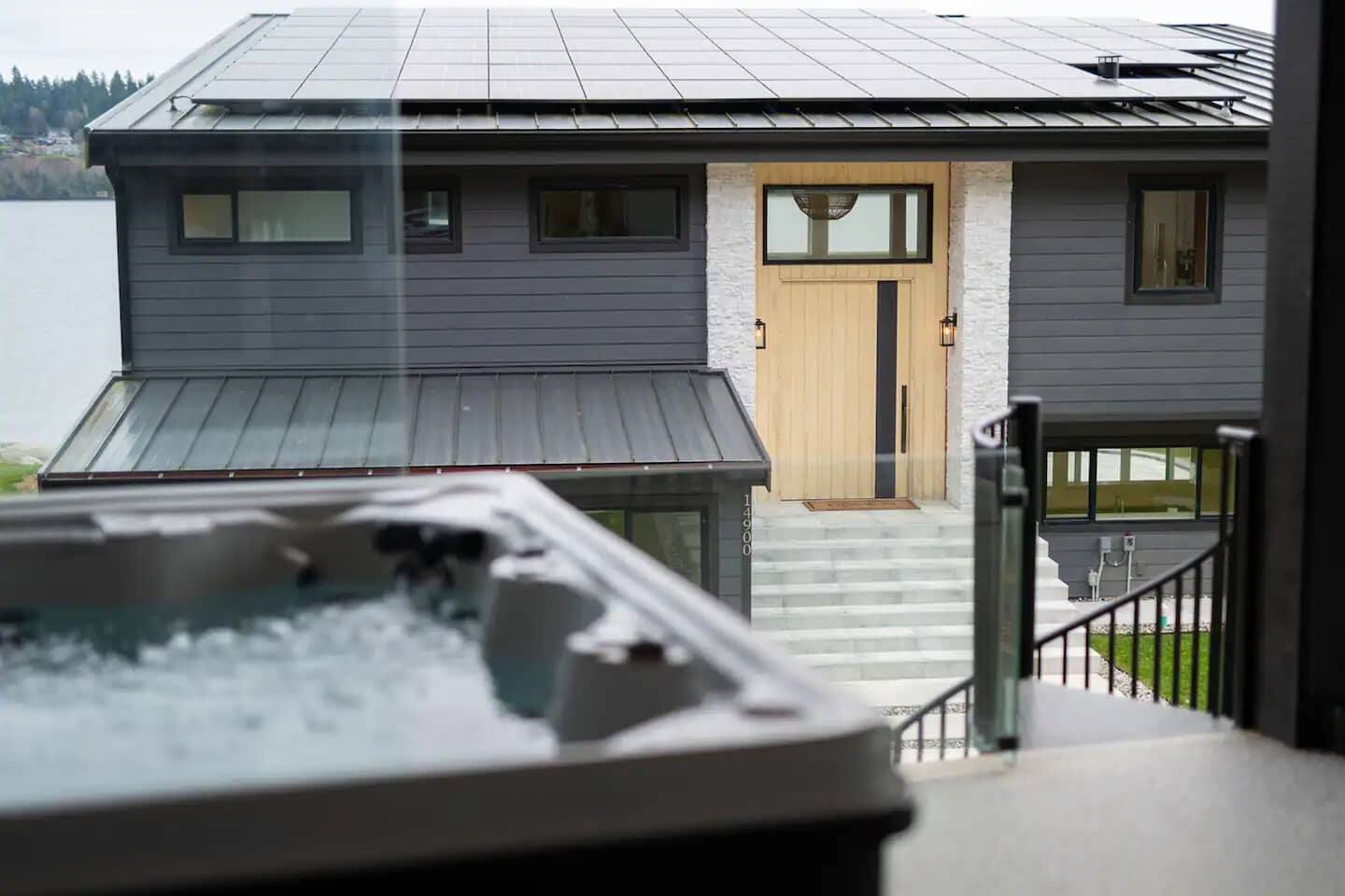 The open-plan kitchen features high-end appliances, a breakfast bar, ample counter space, two sinks, dishwasher, and a large induction cooktop for all your culinary needs. The adjacent upper spacious common area has a couch and Smart TV along with a dining table which seats eight guests with views of the water, making it ideal for hosting gourmet dinners or casual gatherings. The master bedroom, with its own set of floor-to-ceiling windows and TV, offers a peaceful retreat complete with a walk-in steam shower, bidet, and a spacious walk-in closet. The lower level is dedicated to entertainment and relaxation. The downstairs seating area has its own Smart TV and a kitchenette that opens onto the backyard. Two additional bedrooms with generous sleeping space, TVs, and a well-appointed bathroom ensure privacy and comfort for all guests. A separate guest house awaits, featuring a grand, high-ceilinged entrance with a white, glass-paneled door that invites natural light into the space. Inside, you'll find a cozy bedroom with three full-sized beds and a stylish bathroom.. Outside, the guest house has a private hot tub and dining set on the deck providing the perfect setting for outdoor meals or entertaining. An outdoor spiral staircase connects the guest house to the rest of the property, allowing guests to seamlessly enjoy the entire space. Beyond just a place to stay, this contemporary retreat offers an experience of modern luxury and waterfront living. Whether you are looking for a peaceful escape or a stylish gathering spot, our waterfront oasis promises an unforgettable stay.