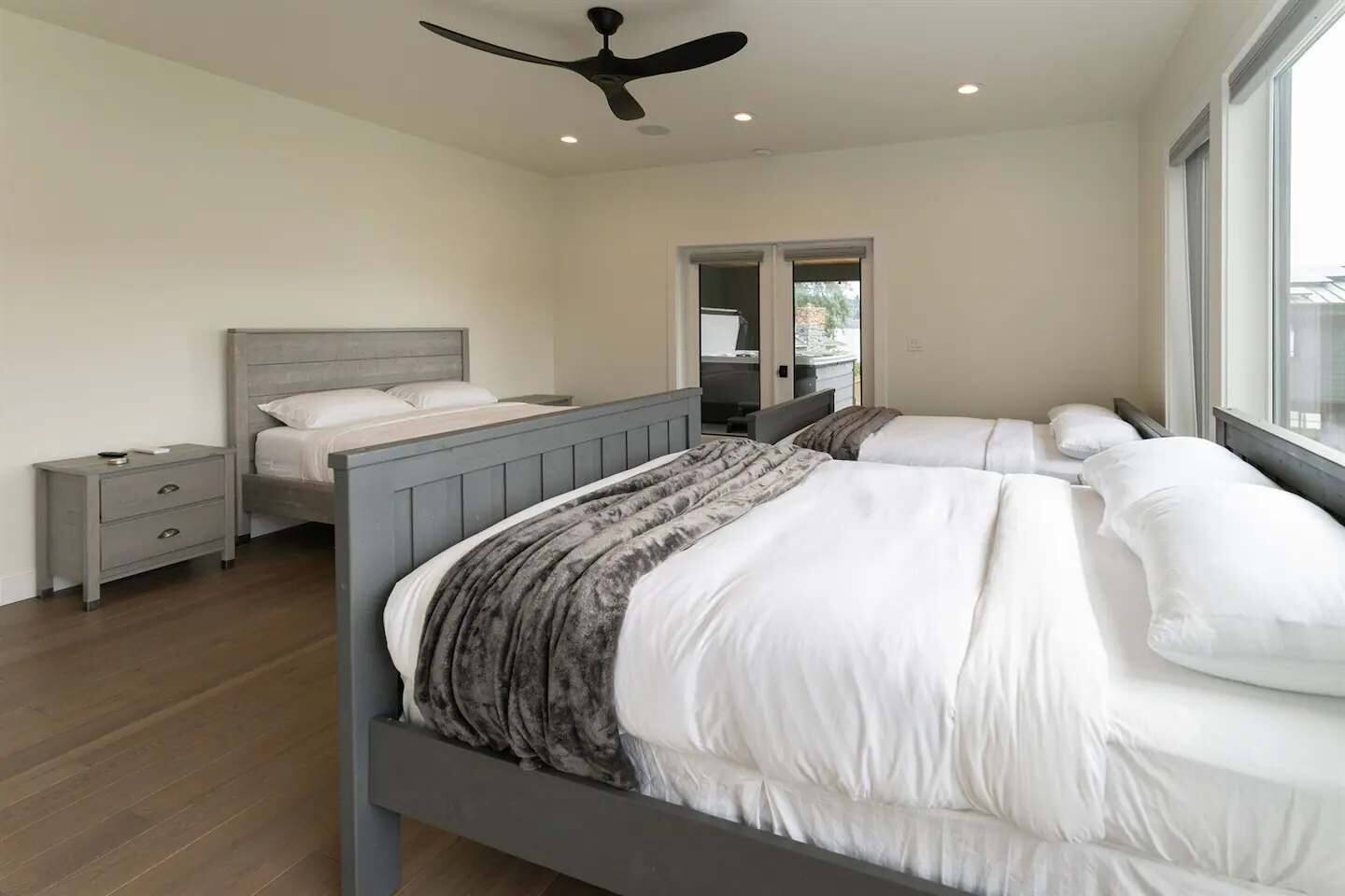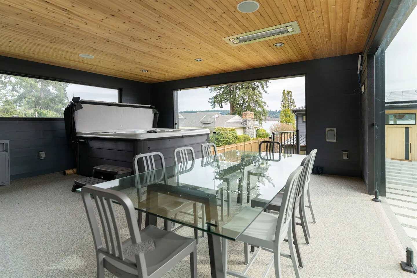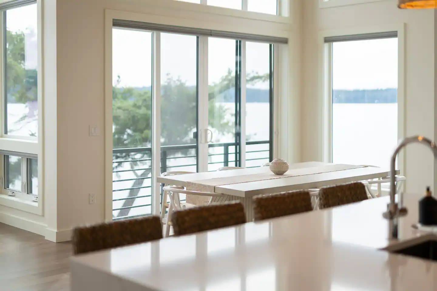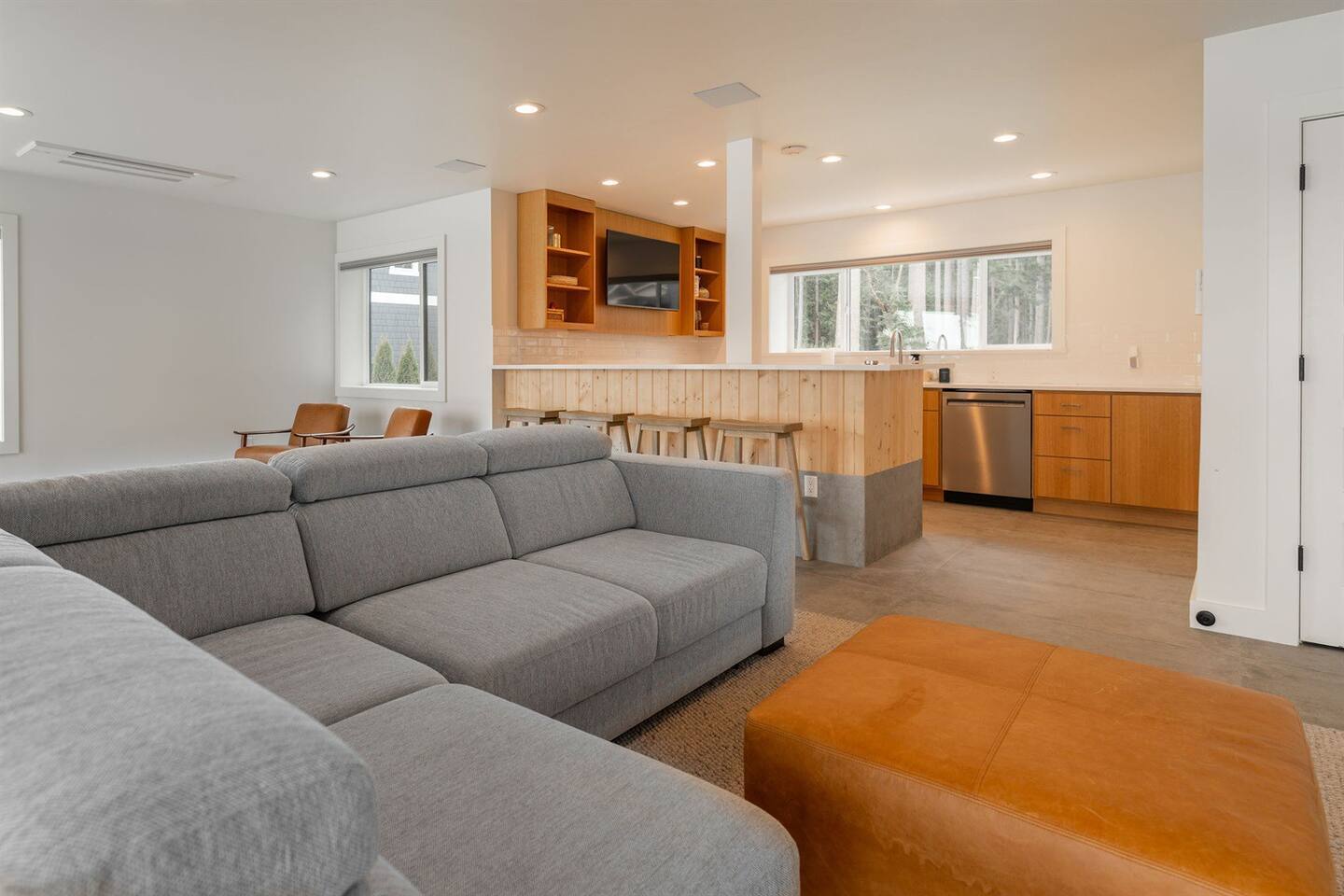 The open-plan kitchen features high-end appliances, a breakfast bar, ample counter space, two sinks, dishwasher, and a large induction cooktop for all your culinary needs. The adjacent upper spacious common area has a couch and Smart TV along with a dining table which seats eight guests with views of the water, making it ideal for hosting gourmet dinners or casual gatherings. The master bedroom, with its own set of floor-to-ceiling windows and TV, offers a peaceful retreat complete with a walk-in steam shower, bidet, and a spacious walk-in closet. The lower level is dedicated to entertainment and relaxation. The downstairs seating area has its own Smart TV and a kitchenette that opens onto the backyard. Two additional bedrooms with generous sleeping space, TVs, and a well-appointed bathroom ensure privacy and comfort for all guests. A separate guest house awaits, featuring a grand, high-ceilinged entrance with a white, glass-paneled door that invites natural light into the space. Inside, you'll find a cozy bedroom with three full-sized beds and a stylish bathroom.. Outside, the guest house has a private hot tub and dining set on the deck providing the perfect setting for outdoor meals or entertaining. An outdoor spiral staircase connects the guest house to the rest of the property, allowing guests to seamlessly enjoy the entire space. Beyond just a place to stay, this contemporary retreat offers an experience of modern luxury and waterfront living. Whether you are looking for a peaceful escape or a stylish gathering spot, our waterfront oasis promises an unforgettable stay.