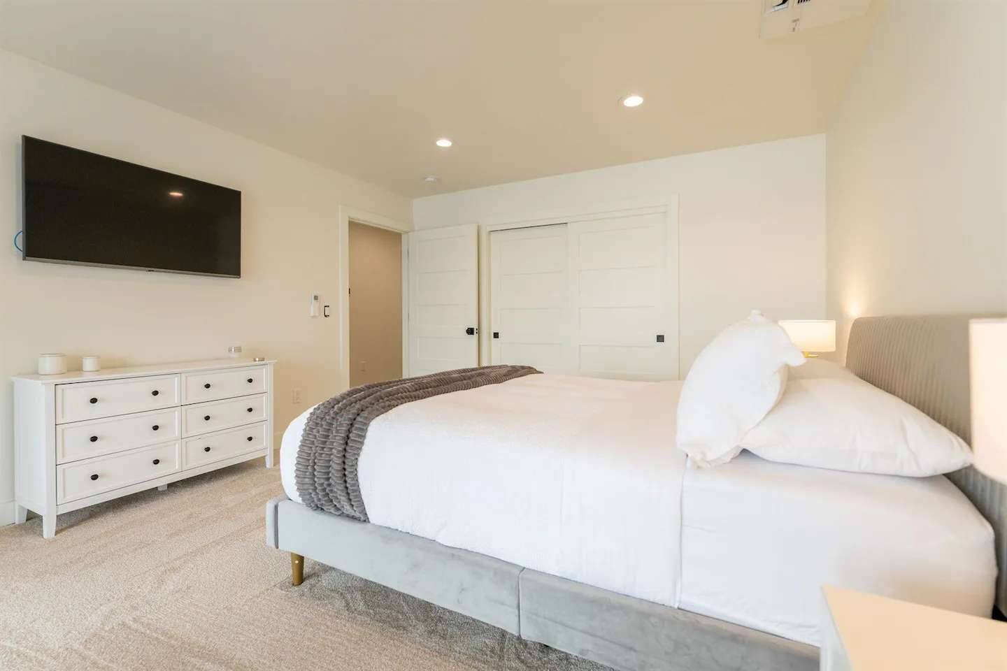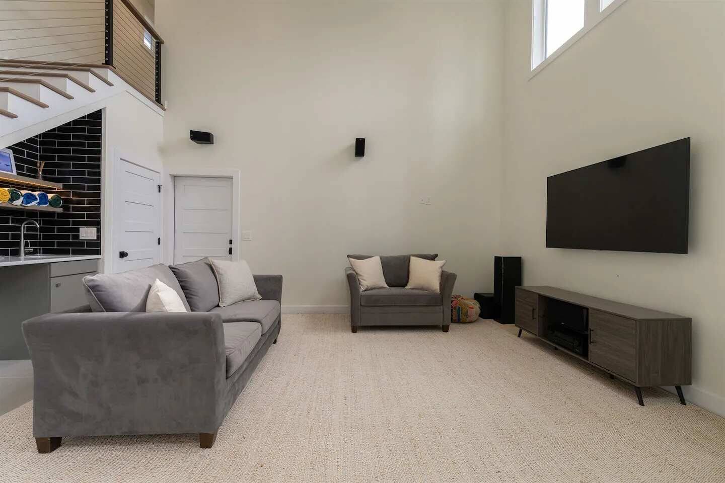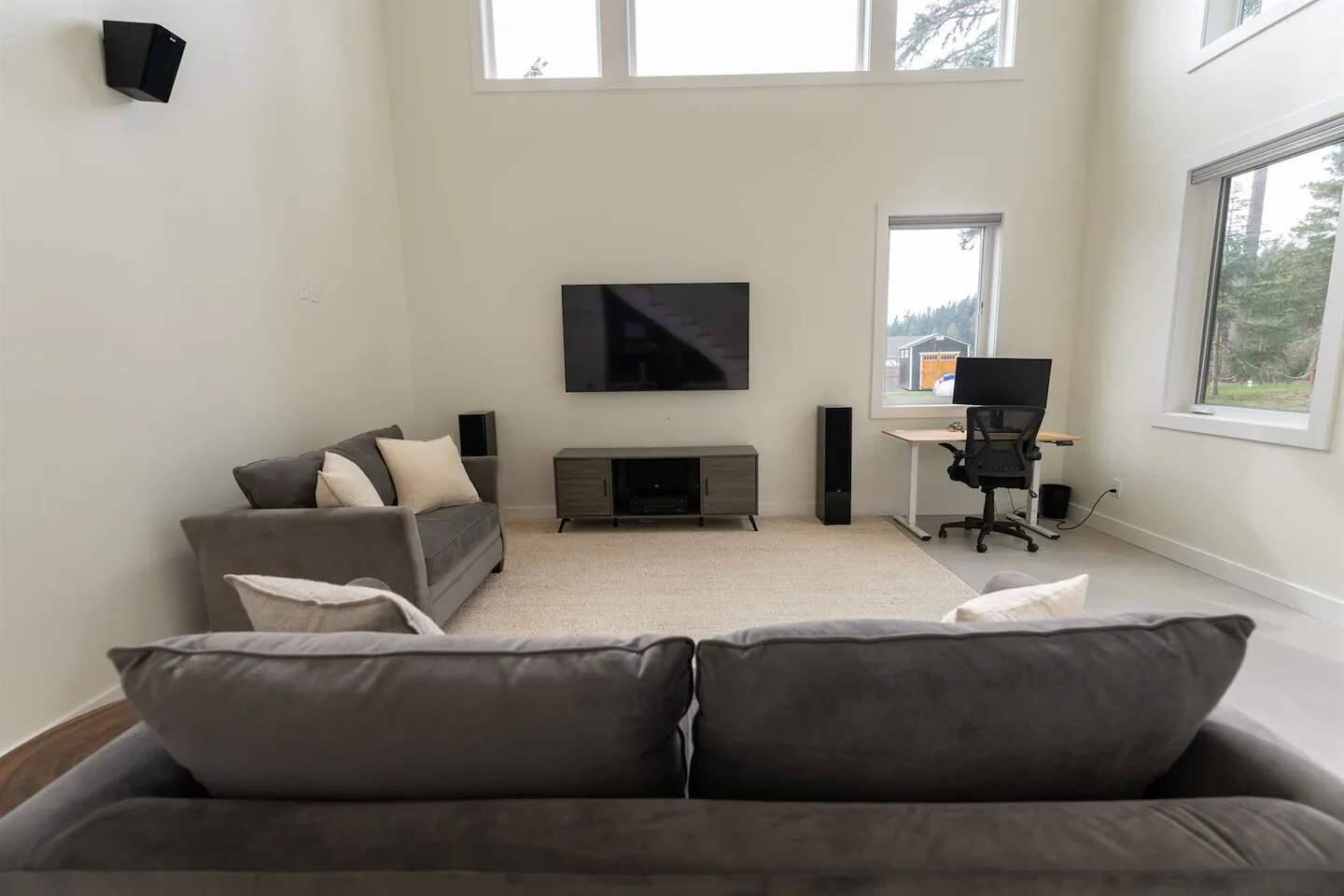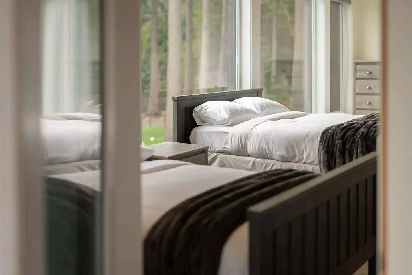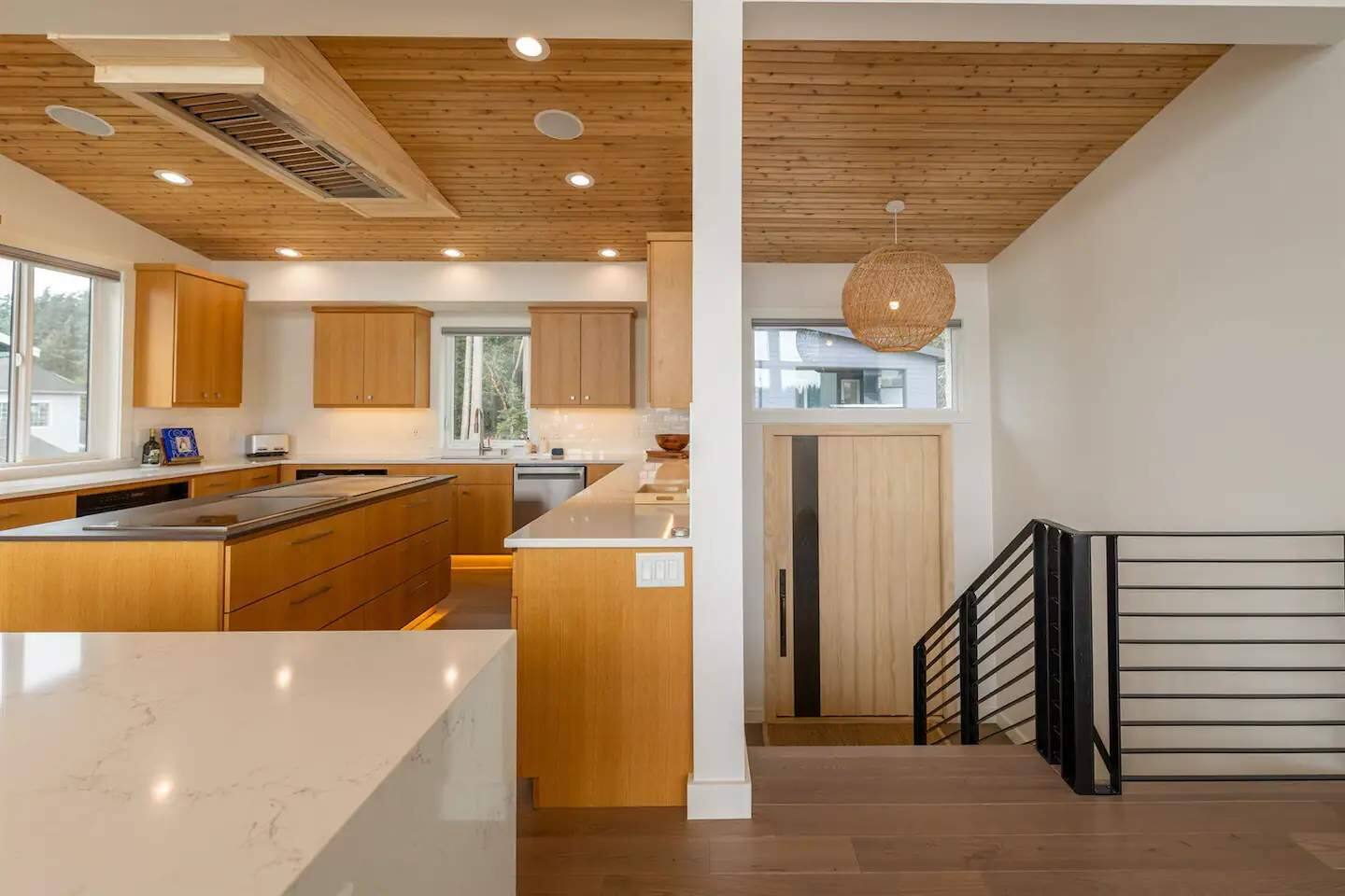 The open-plan kitchen features high-end appliances, a breakfast bar, ample counter space, two sinks, dishwasher, and a large induction cooktop for all your culinary needs. The adjacent upper spacious common area has a couch and Smart TV along with a dining table which seats eight guests with views of the water, making it ideal for hosting gourmet dinners or casual gatherings. The master bedroom, with its own set of floor-to-ceiling windows and TV, offers a peaceful retreat complete with a walk-in steam shower, bidet, and a spacious walk-in closet. The lower level is dedicated to entertainment and relaxation. The downstairs seating area has its own Smart TV and a kitchenette that opens onto the backyard. Two additional bedrooms with generous sleeping space, TVs, and a well-appointed bathroom ensure privacy and comfort for all guests. A separate guest house awaits, featuring a grand, high-ceilinged entrance with a white, glass-paneled door that invites natural light into the space. Inside, you'll find a cozy bedroom with three full-sized beds and a stylish bathroom.. Outside, the guest house has a private hot tub and dining set on the deck providing the perfect setting for outdoor meals or entertaining. An outdoor spiral staircase connects the guest house to the rest of the property, allowing guests to seamlessly enjoy the entire space. Beyond just a place to stay, this contemporary retreat offers an experience of modern luxury and waterfront living. Whether you are looking for a peaceful escape or a stylish gathering spot, our waterfront oasis promises an unforgettable stay.