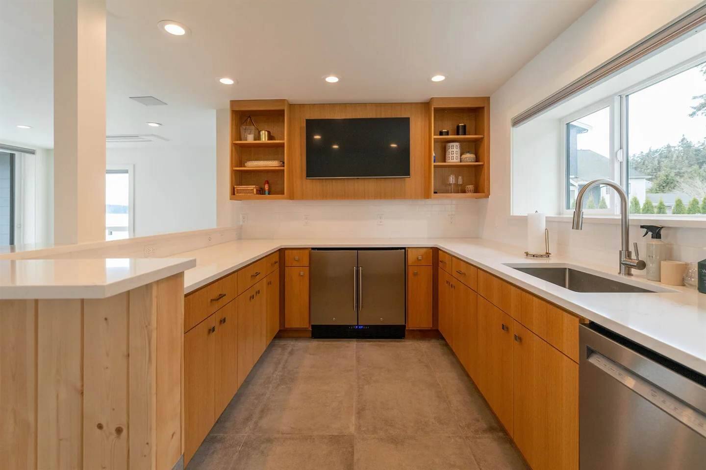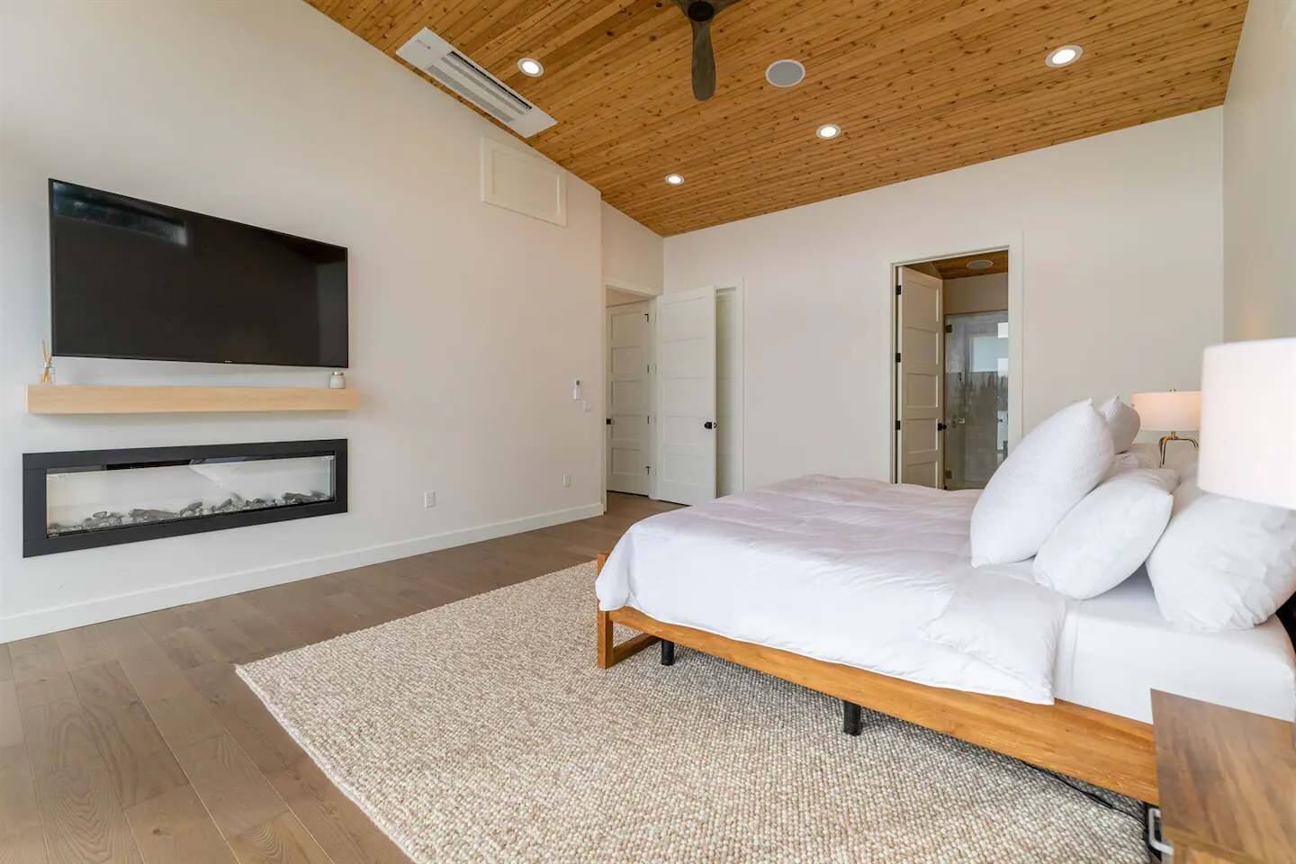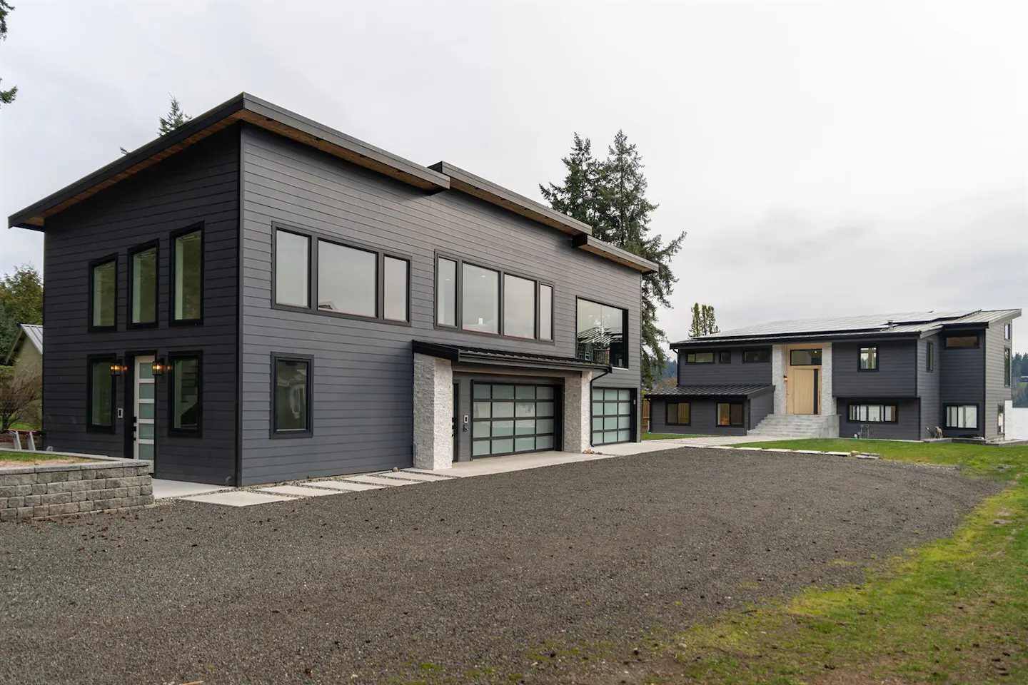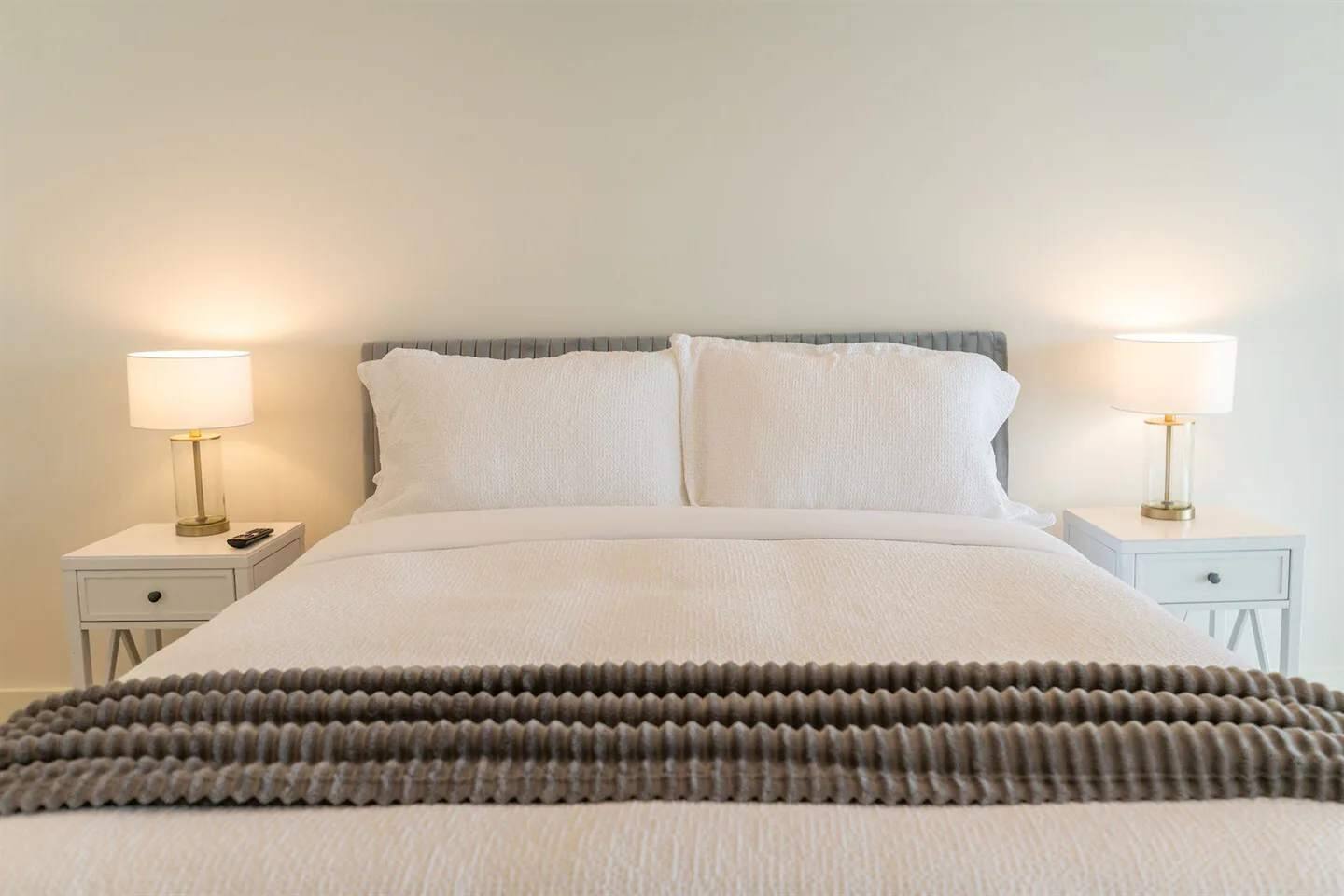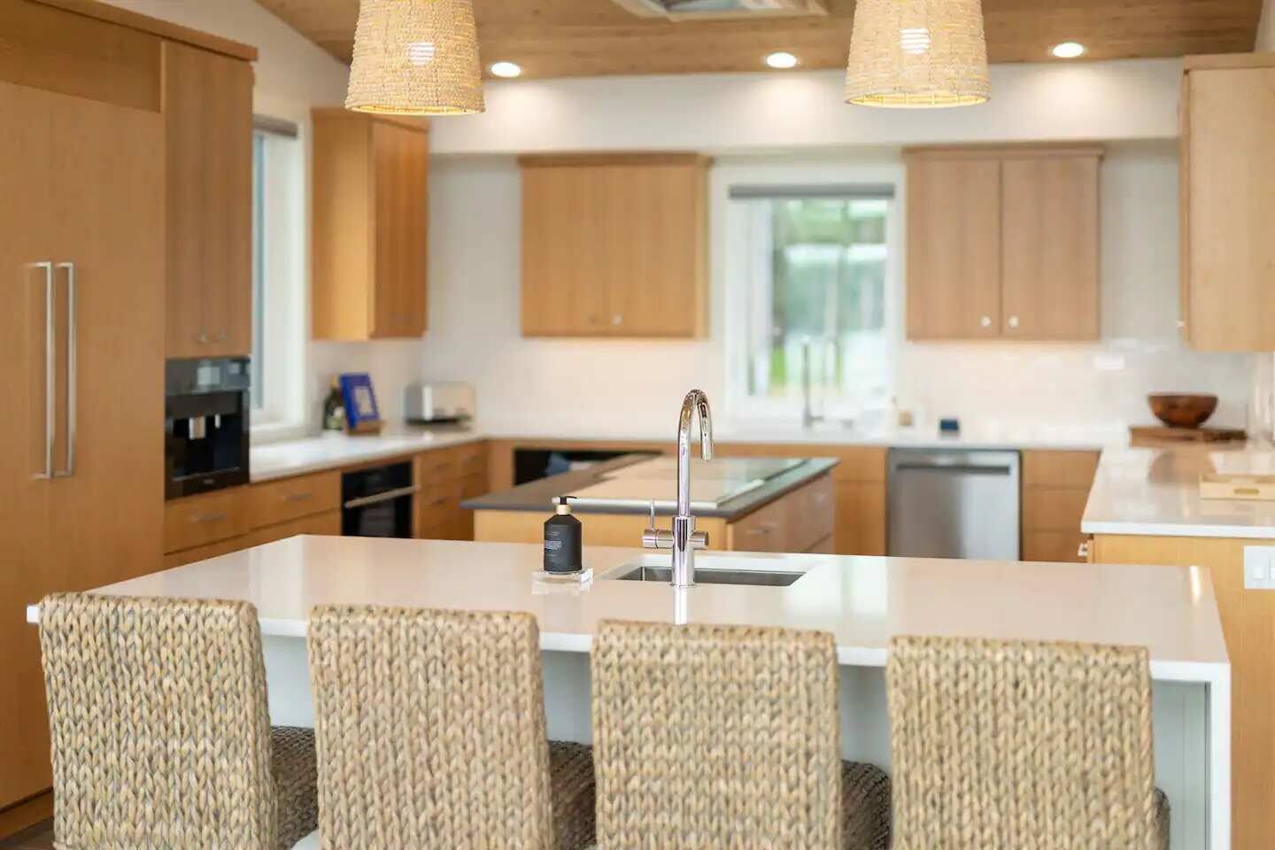 The open-plan kitchen features high-end appliances, a breakfast bar, ample counter space, two sinks, dishwasher, and a large induction cooktop for all your culinary needs. The adjacent upper spacious common area has a couch and Smart TV along with a dining table which seats eight guests with views of the water, making it ideal for hosting gourmet dinners or casual gatherings. The master bedroom, with its own set of floor-to-ceiling windows and TV, offers a peaceful retreat complete with a walk-in steam shower, bidet, and a spacious walk-in closet. The lower level is dedicated to entertainment and relaxation. The downstairs seating area has its own Smart TV and a kitchenette that opens onto the backyard. Two additional bedrooms with generous sleeping space, TVs, and a well-appointed bathroom ensure privacy and comfort for all guests. A separate guest house awaits, featuring a grand, high-ceilinged entrance with a white, glass-paneled door that invites natural light into the space. Inside, you'll find a cozy bedroom with three full-sized beds and a stylish bathroom.. Outside, the guest house has a private hot tub and dining set on the deck providing the perfect setting for outdoor meals or entertaining. An outdoor spiral staircase connects the guest house to the rest of the property, allowing guests to seamlessly enjoy the entire space. Beyond just a place to stay, this contemporary retreat offers an experience of modern luxury and waterfront living. Whether you are looking for a peaceful escape or a stylish gathering spot, our waterfront oasis promises an unforgettable stay.