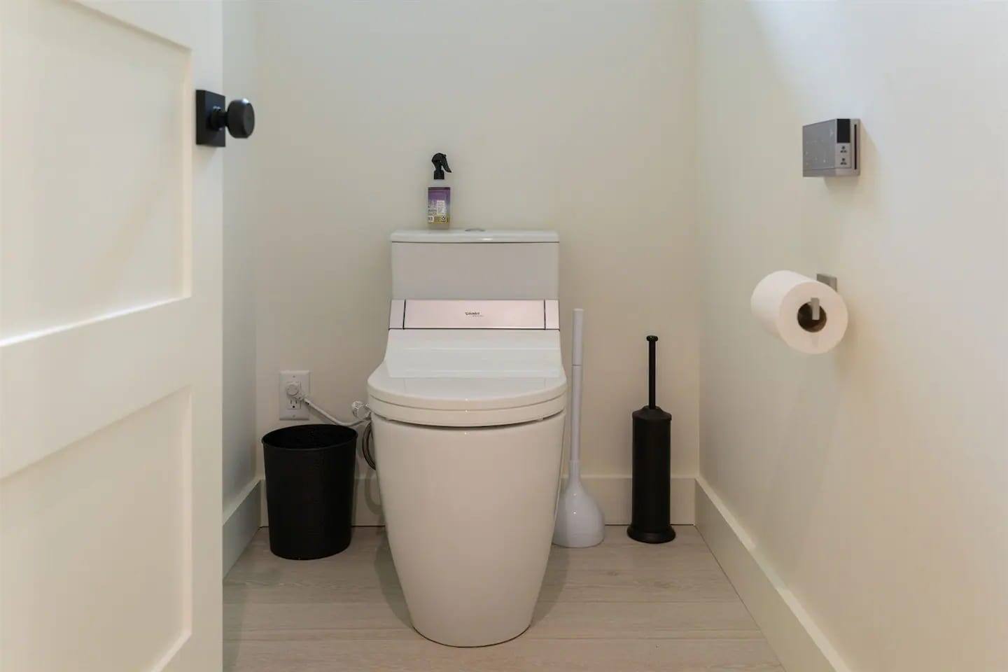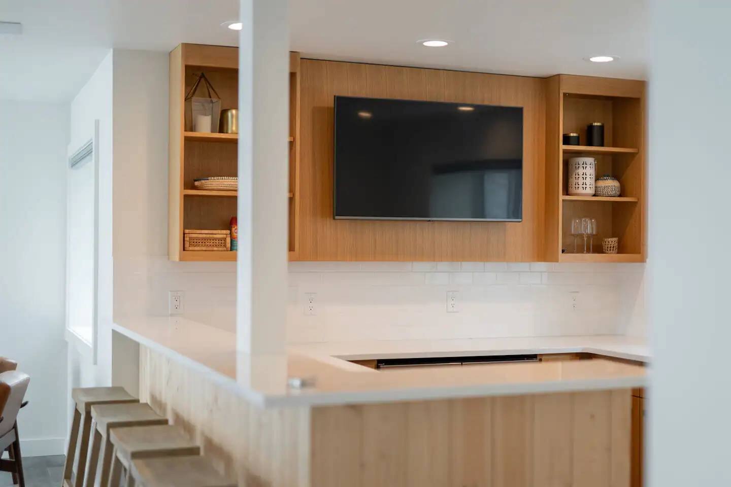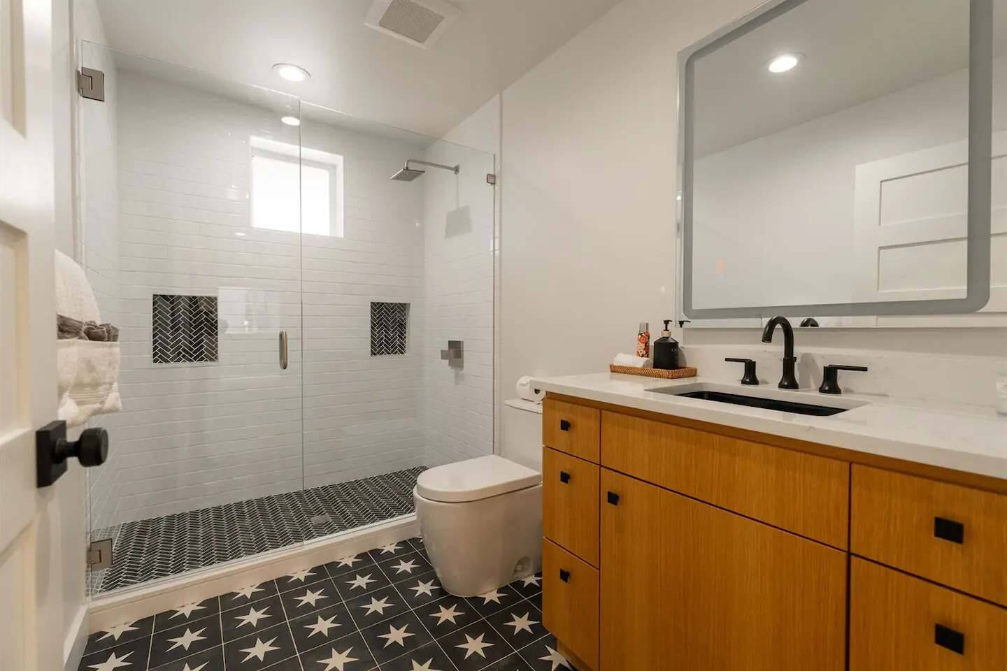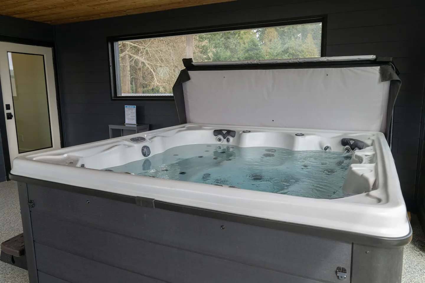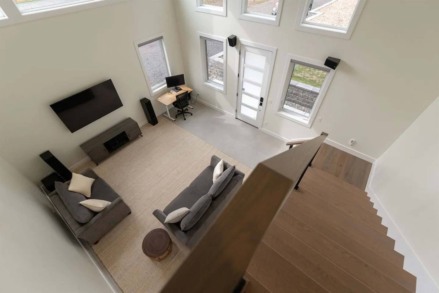 The open-plan kitchen features high-end appliances, a breakfast bar, ample counter space, two sinks, dishwasher, and a large induction cooktop for all your culinary needs. The adjacent upper spacious common area has a couch and Smart TV along with a dining table which seats eight guests with views of the water, making it ideal for hosting gourmet dinners or casual gatherings. The master bedroom, with its own set of floor-to-ceiling windows and TV, offers a peaceful retreat complete with a walk-in steam shower, bidet, and a spacious walk-in closet. The lower level is dedicated to entertainment and relaxation. The downstairs seating area has its own Smart TV and a kitchenette that opens onto the backyard. Two additional bedrooms with generous sleeping space, TVs, and a well-appointed bathroom ensure privacy and comfort for all guests. A separate guest house awaits, featuring a grand, high-ceilinged entrance with a white, glass-paneled door that invites natural light into the space. Inside, you'll find a cozy bedroom with three full-sized beds and a stylish bathroom.. Outside, the guest house has a private hot tub and dining set on the deck providing the perfect setting for outdoor meals or entertaining. An outdoor spiral staircase connects the guest house to the rest of the property, allowing guests to seamlessly enjoy the entire space. Beyond just a place to stay, this contemporary retreat offers an experience of modern luxury and waterfront living. Whether you are looking for a peaceful escape or a stylish gathering spot, our waterfront oasis promises an unforgettable stay.