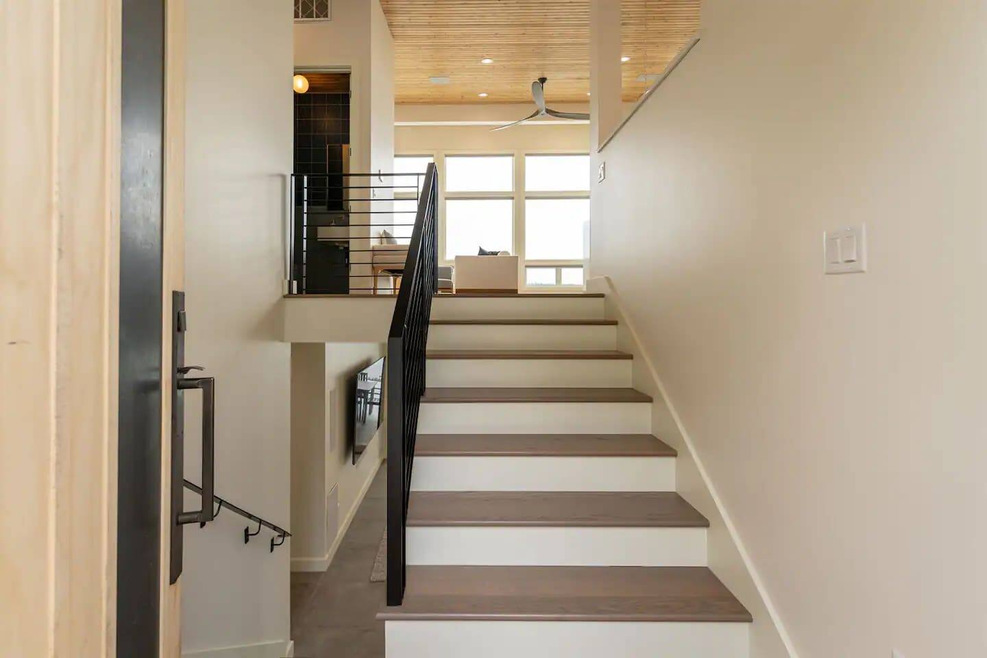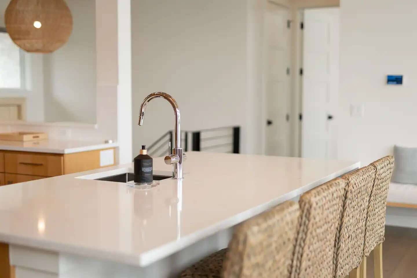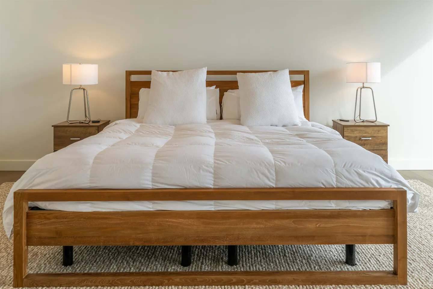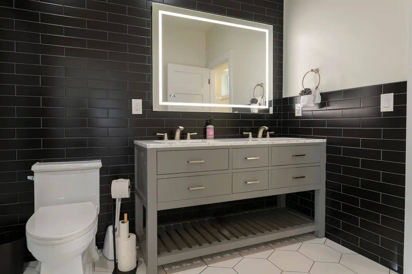 The open-plan kitchen features high-end appliances, a breakfast bar, ample counter space, two sinks, dishwasher, and a large induction cooktop for all your culinary needs. The adjacent upper spacious common area has a couch and Smart TV along with a dining table which seats eight guests with views of the water, making it ideal for hosting gourmet dinners or casual gatherings. The master bedroom, with its own set of floor-to-ceiling windows and TV, offers a peaceful retreat complete with a walk-in steam shower, bidet, and a spacious walk-in closet. The lower level is dedicated to entertainment and relaxation. The downstairs seating area has its own Smart TV and a kitchenette that opens onto the backyard. Two additional bedrooms with generous sleeping space, TVs, and a well-appointed bathroom ensure privacy and comfort for all guests. A separate guest house awaits, featuring a grand, high-ceilinged entrance with a white, glass-paneled door that invites natural light into the space. Inside, you'll find a cozy bedroom with three full-sized beds and a stylish bathroom.. Outside, the guest house has a private hot tub and dining set on the deck providing the perfect setting for outdoor meals or entertaining. An outdoor spiral staircase connects the guest house to the rest of the property, allowing guests to seamlessly enjoy the entire space. Beyond just a place to stay, this contemporary retreat offers an experience of modern luxury and waterfront living. Whether you are looking for a peaceful escape or a stylish gathering spot, our waterfront oasis promises an unforgettable stay.
