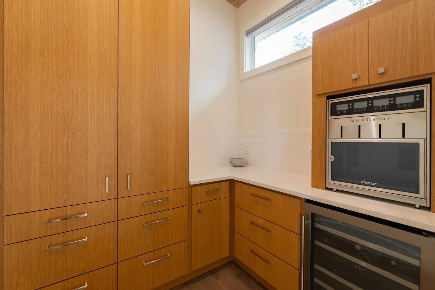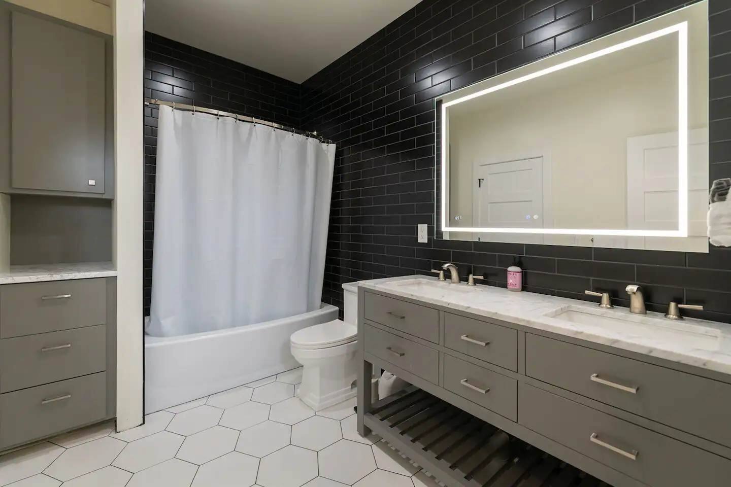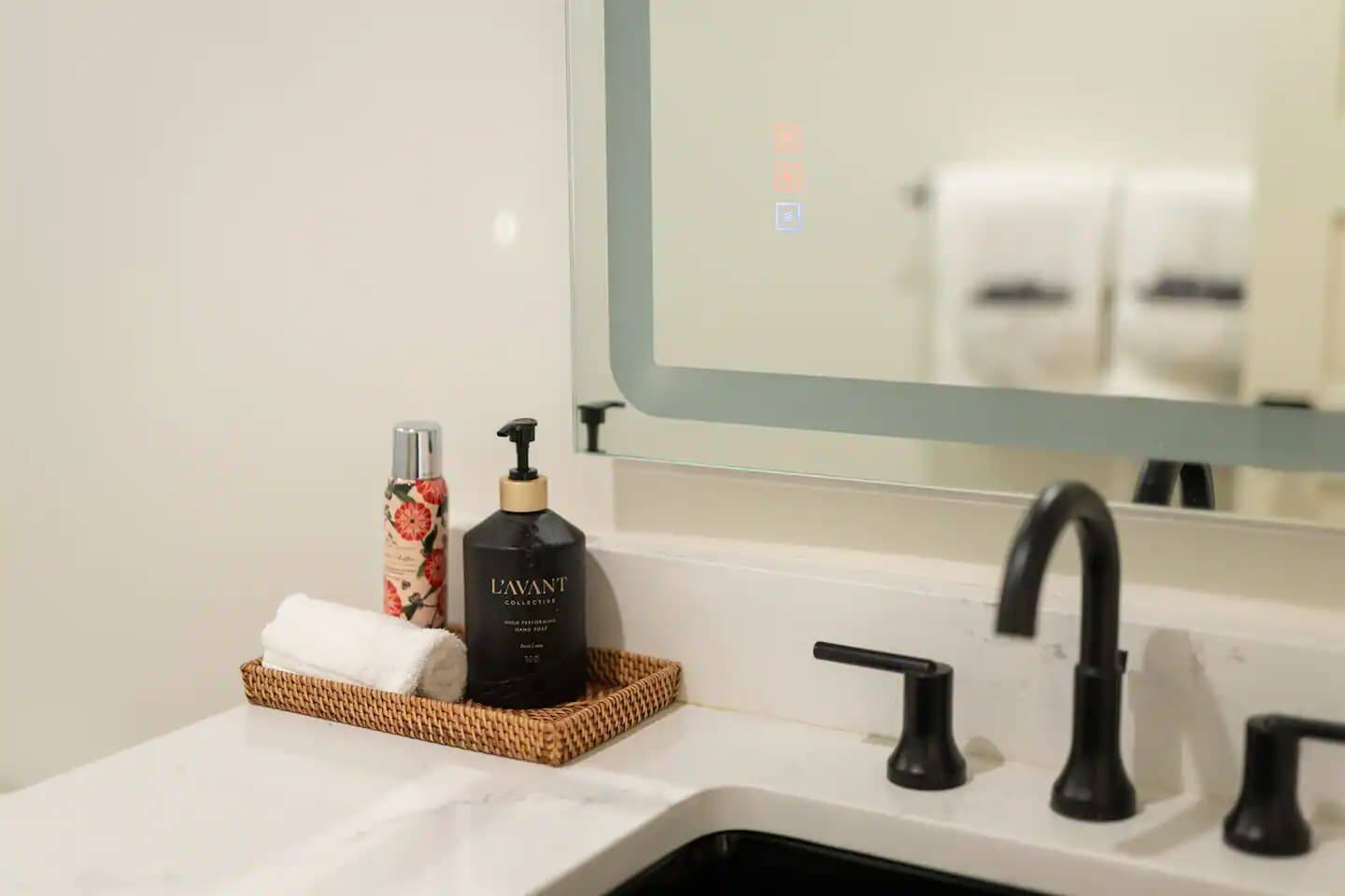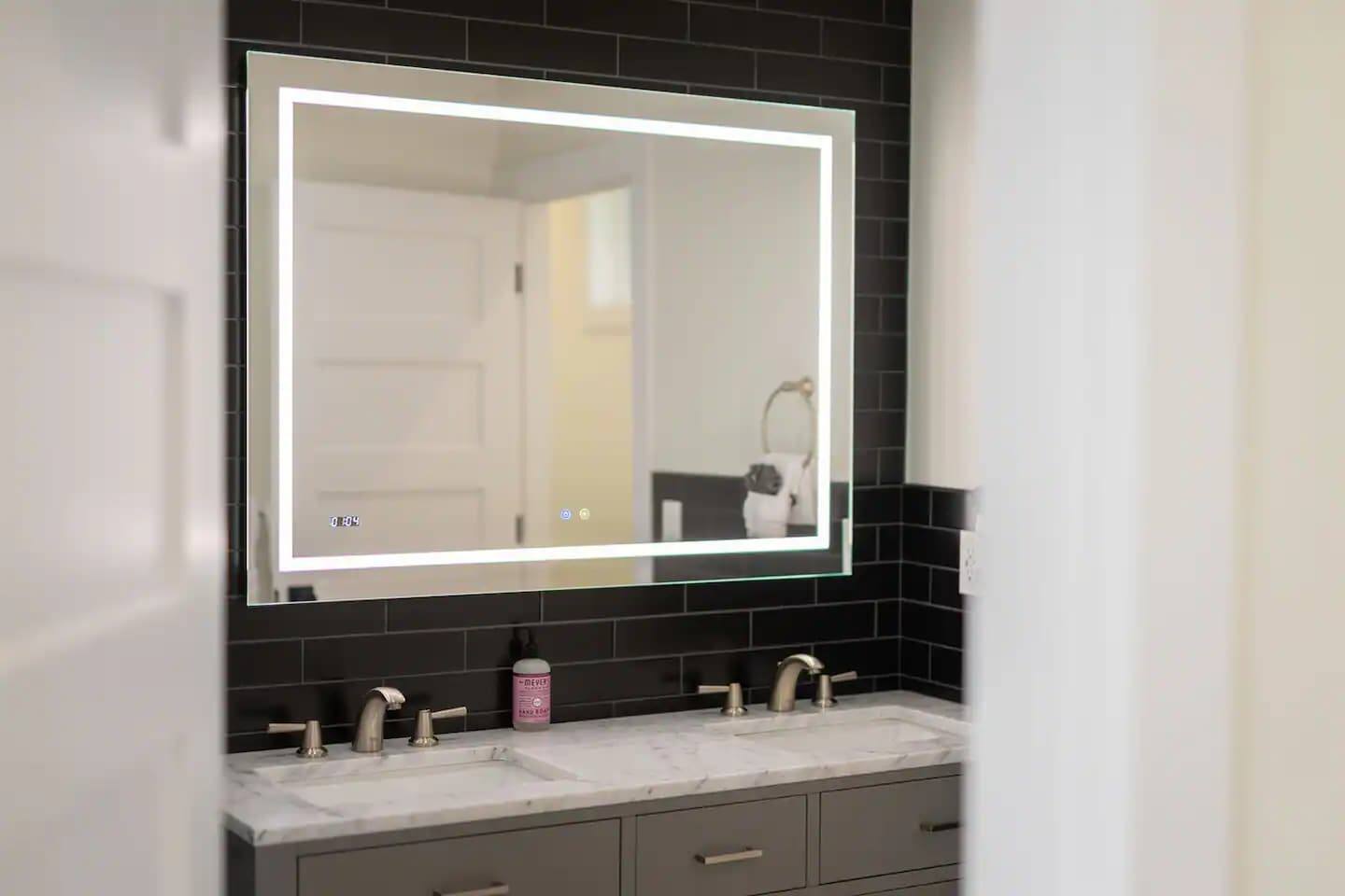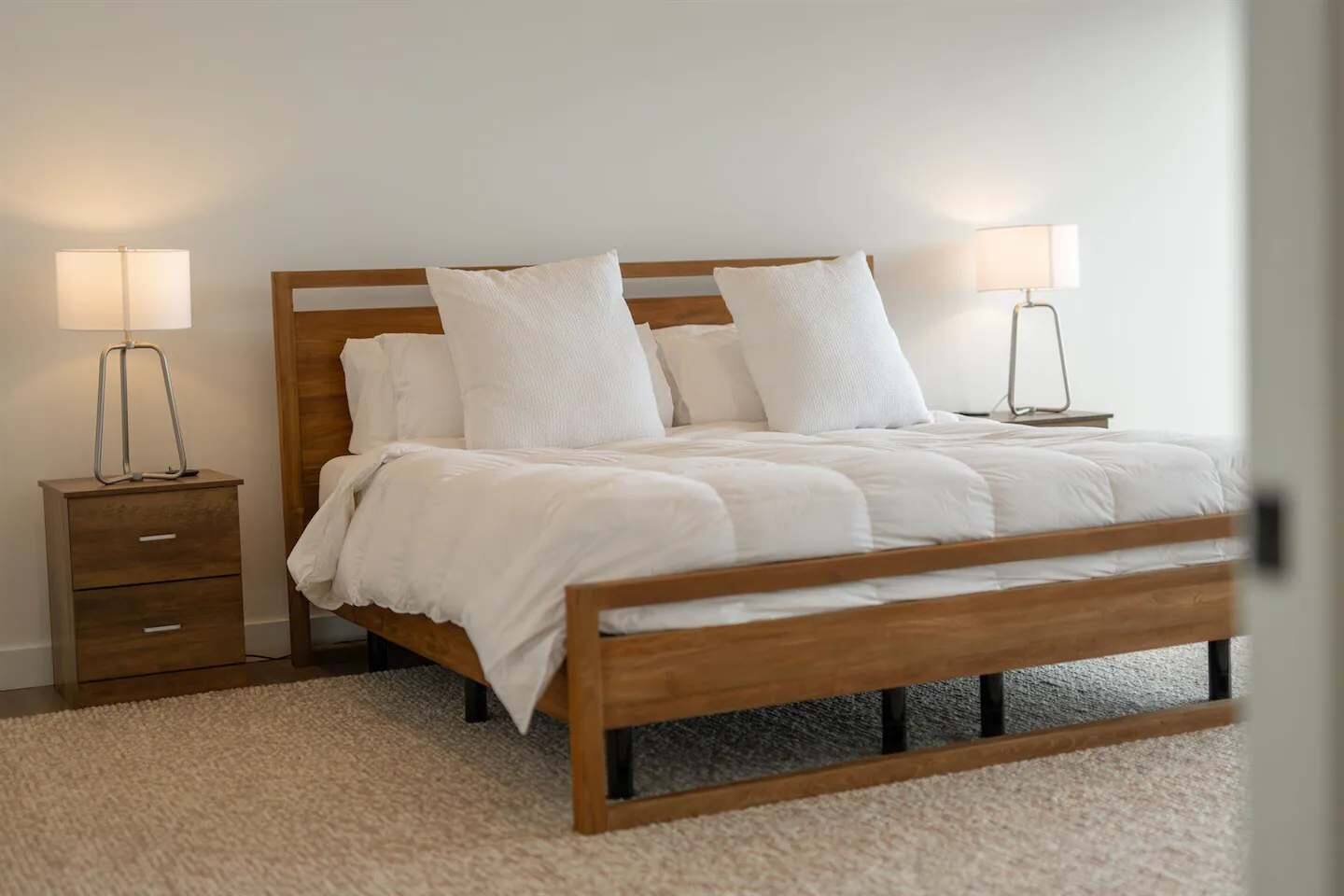 The open-plan kitchen features high-end appliances, a breakfast bar, ample counter space, two sinks, dishwasher, and a large induction cooktop for all your culinary needs. The adjacent upper spacious common area has a couch and Smart TV along with a dining table which seats eight guests with views of the water, making it ideal for hosting gourmet dinners or casual gatherings. The master bedroom, with its own set of floor-to-ceiling windows and TV, offers a peaceful retreat complete with a walk-in steam shower, bidet, and a spacious walk-in closet. The lower level is dedicated to entertainment and relaxation. The downstairs seating area has its own Smart TV and a kitchenette that opens onto the backyard. Two additional bedrooms with generous sleeping space, TVs, and a well-appointed bathroom ensure privacy and comfort for all guests. A separate guest house awaits, featuring a grand, high-ceilinged entrance with a white, glass-paneled door that invites natural light into the space. Inside, you'll find a cozy bedroom with three full-sized beds and a stylish bathroom.. Outside, the guest house has a private hot tub and dining set on the deck providing the perfect setting for outdoor meals or entertaining. An outdoor spiral staircase connects the guest house to the rest of the property, allowing guests to seamlessly enjoy the entire space. Beyond just a place to stay, this contemporary retreat offers an experience of modern luxury and waterfront living. Whether you are looking for a peaceful escape or a stylish gathering spot, our waterfront oasis promises an unforgettable stay.
