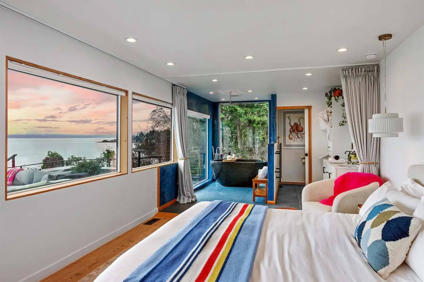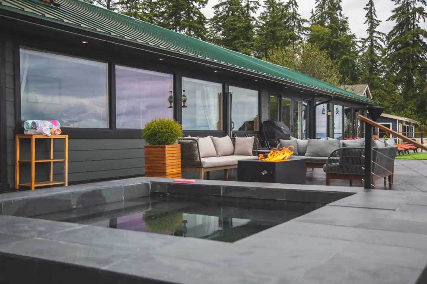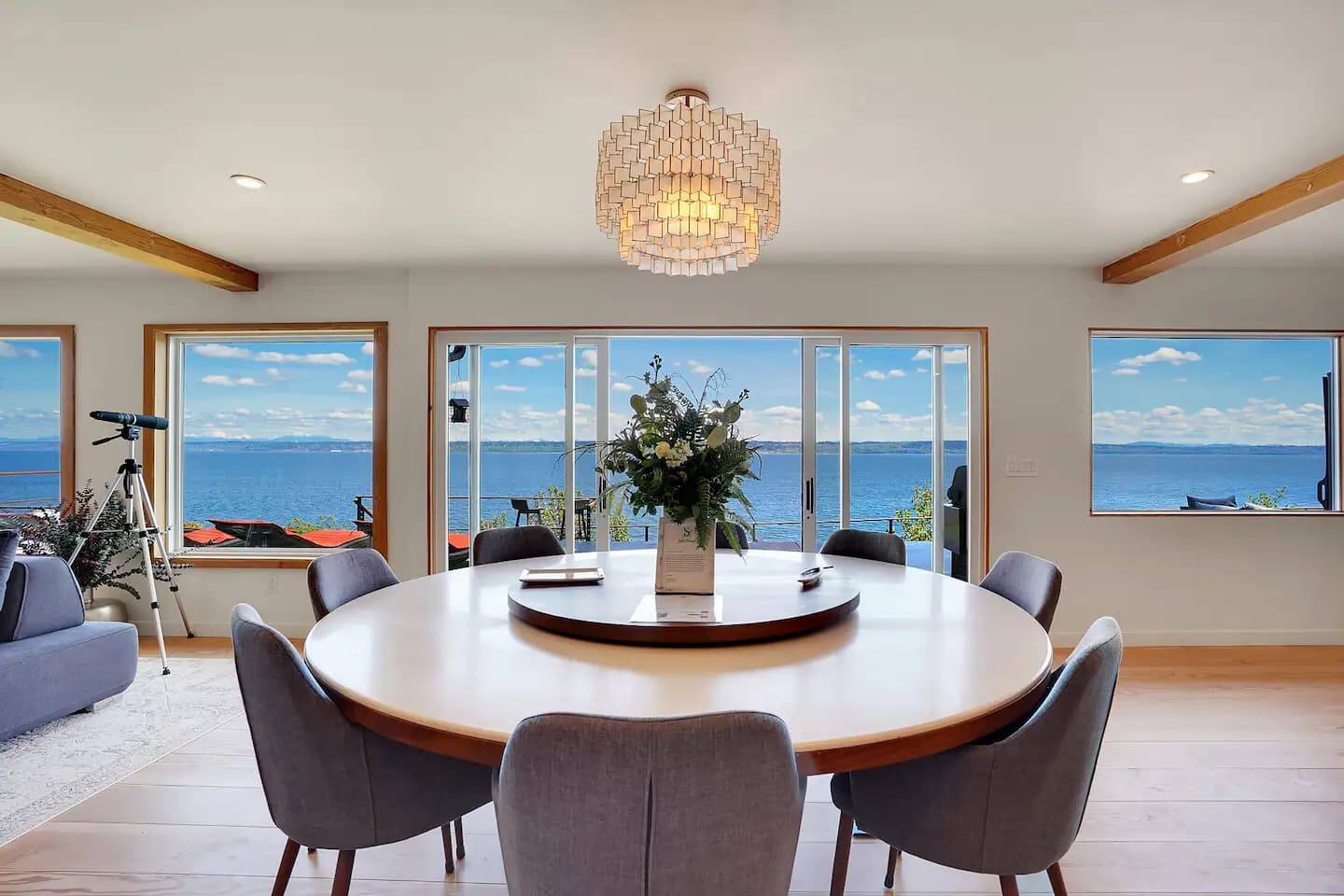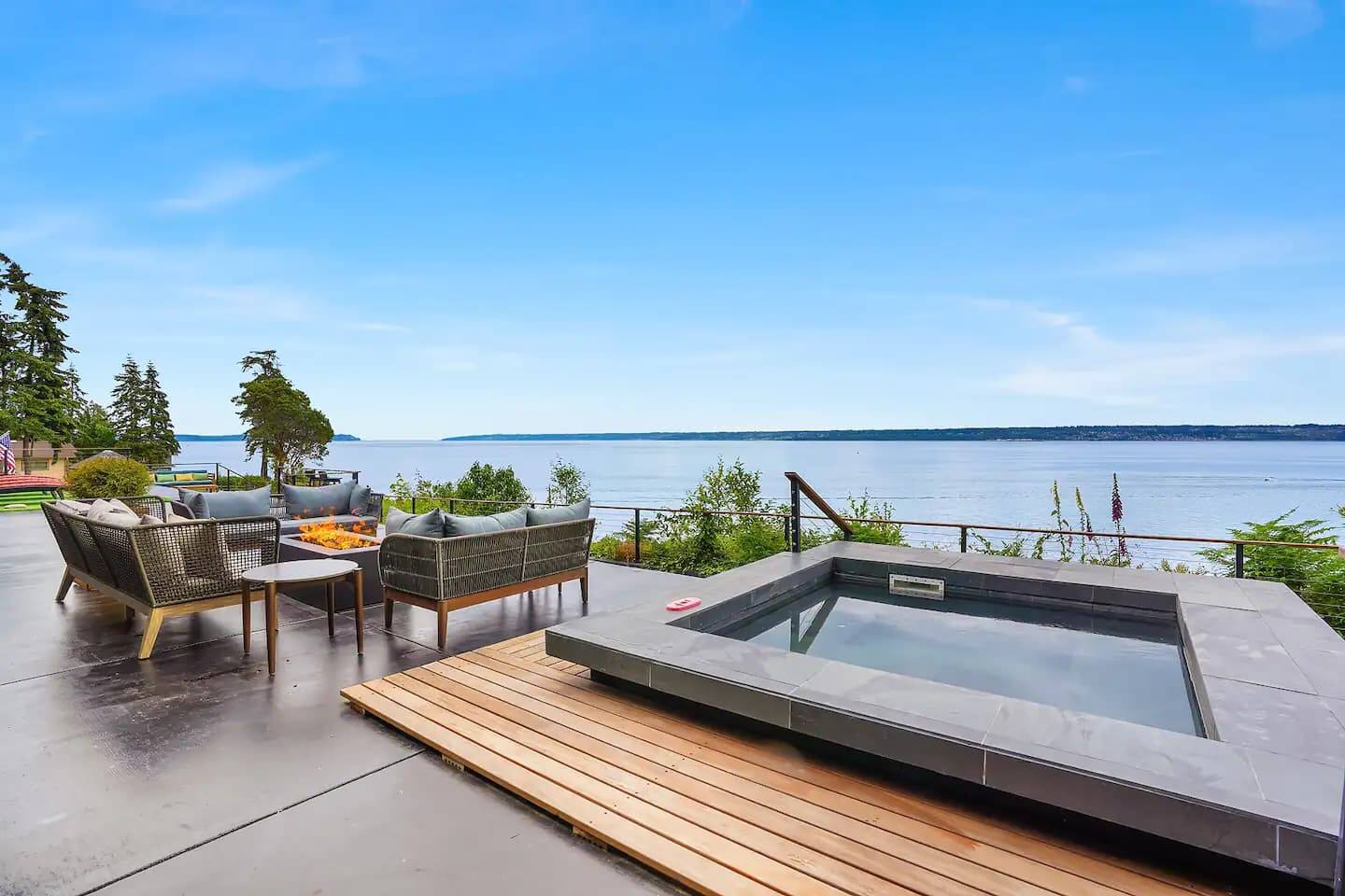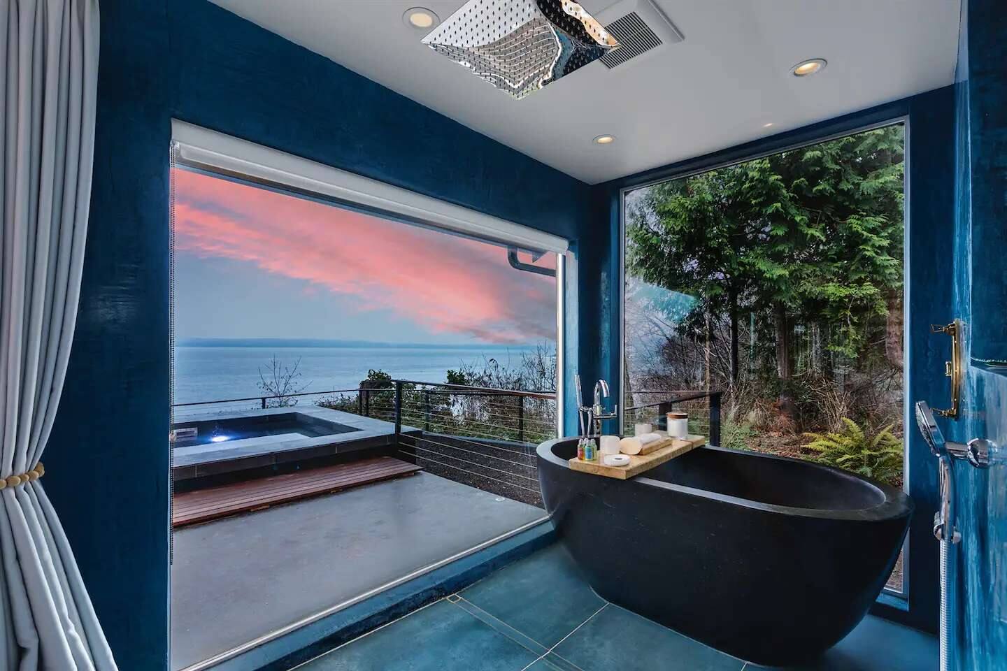 ☀ 4 exquisitely-designed bedrooms, each with a unique vibe, ocean views, and outfitted with luxurious linens ☀ Spa-like bathrooms: open-air, curb-less, rain showerheads, radiant floor heating, premium toiletries, robes and slippers, towel warmers ☀ 6-person JAPANESE SOAKING TUB with a blazing 200btu fire pit, and an extensive variety of outdoor lounge areas ☀ EXTENDABLE AWNING on the patio so you can enjoy the outdoors even when it's raining ☀ Fully-equipped kitchen with gas stove, propane BBQ grill, serving trays, and breakfast items provided ☀ PRIVATE BEACH AREA with a picnic table and direct access to the water ☀ Weekly, local, fresh flower service with fresh flowers provided throughout the home ☀ CONCIERGE : How can we make it special for your group? Boat rentals, float plane experiences, paddleboards, Chefs, Masseuse and more! SaltWood Bluff offers a vacation experience you'll never forget. This one-of-a-kind property immerses you into the rich history and culture of the Pacific Northwest. With large windows, skylights, and lots of open air, the 2,200 sq. ft. home is designed to maximize your enjoyment of the beautiful surrounding nature. Lose yourself in the breathtaking views of the Seattle skyline, Mt Rainier, Mt Baker, the Cascades, and stay entertained all day watching boat traffic, bald eagles, osprey, seals, otters, whales and so much more. If you're headed to Olympic National Park, this is the perfect home to come back to after a long day's journey into the wilderness. Calling all BIRDERS! This location is a special treat that offers vibrant birdlife right outside the back door. Kitsap county, in particular, is a birdwatcher's paradise with the likes of bald eagles, Anna's hummingbird, dark-eyed junco, great blue heron and much more whizzing right by the bluffs of the Puget Sound. Grab some binoculars and don't miss your chance to witness this thrilling sight! Some kind words from past guests... "...a bona fide treat to spend time and bask in the incredible beauty there..." "...The love and care that was poured into the home is palpable..." "...even better in person than the photos..." ☆☆ BATHROOMS ☆☆ ☀ Towel warmers and Heated floors ☀ Deep soaking tub ☀ Curbless showers ☀ Premium towels and toiletries ☀ Rainshower, handhelds, and shower jets The master bedroom features an open-air bathroom that blurs the lines between indoor and outdoor living. The space is equipped with a giant overhead rain shower, handheld jet, a custom-made marble tub, and towel warmer. No matter where you stand, you’re surrounded by tranquil blue walls and expansive windows so you can see the Puget Sound. The open bathroom in the PNW room features a sleek black vanity, marbled floors and walls, and an overhead shower with horizontal shower jets. The third bathroom ensuite is shared, featuring white subway tile, modern shower features, a towel warmer, and fresh eucalyptus so you feel like you’re at the spa. ☆☆ KITCHEN & DINING ☆☆ ☀ Fully-equipped kitchen ☀ 5-burner gas stove & 2 ovens ☀ Serving trays and utensils for the whole family ☀ Coffee, tea, eggs, and pancakes provided ☀ Complimentary grocery delivery service The gourmet kitchen is a chef’s dream, mixing modern design and retro style with all-natural woods, chrome, and stainless steel. Prepare homemade meals in the open-concept kitchen while still interacting with friends and family throughout the home. As with every other room in the house, you won’t miss any action on the water while cooking or doing the dishes, as the floor-to-ceiling glass doors let you see the Sound no matter where you’re standing. You’ll find state-of-the-art appliances, kitchen gadgets, a 6qt Instant Pot, nonstick ceramic pots and pans, silverware, glassware, and anything else you’d ever need to whip up a decadent meal for the whole group. You’ll also find a premium coffee and tea bar, farm-fresh local eggs, and pancake mix so you’ve got breakfast covered. Enjoy your meals at the elevated breakfast bar made of Sapele wood, or at the 10-seater round dining table with a lazy Susan. ☆☆ FAMILY ROOM & LIVING AREA ☆☆ ☀ 65" Smart TV with high-speed wi-fi ☀ Soft, heated, electric blankets ☀ Genuine leather sofa and sheepskin rugs ☀ Telescope and Binoculars for birdwatching and marine life ☀ Enormous windows and sliding doors to enjoy the sight and smell of the Puget Sound The main living room which overlooks the water is a calming blend of serenity and amazement. Settle into the cozy couches or relax on the cotton poof tucked under the windows. Sink your feet into the plush sheepskin carpets and keep your gaze out the window so you don’t miss a moment of the action. Modern decor and unbeatable views make this a prime place to unwind. ☆☆ OUTSIDE SPACE ☆☆ ☀ Weber propane BBQ grill, gas provided ☀ Custom-built hot tub with capacity for up to 6 people ☀ Custom-built firepit with 200,000 BTUs to keep you warm ☀ A variety of seating options including 4 chaise lounge chairs for sunbathing ☀ Kayak & Stand-up paddleboard launch The living room has a 65" Smart TV, but chances are you won’t even notice when you see all that the elegant outdoors has to offer. The back of the house faces east and contains 10 pieces of 4'x4' glass. Brew some coffee and enjoy brunch on deck during sunrise! This space has two separate outdoor sectionals, a fire pit, and an incredible hot tub overlooking the water. Bring a good book out to the back and relax in one of the chaise lounges, or use the telescope to look for birds and wildlife. Follow the walkway and staircase down to the private beach to go kayaking, paddle board, search for clams, or a simple morning stroll on the sandy shores of Kingston. ★☆ Send us a message to book your one-of-a-kind experience in Kingston, Washington! ☆★