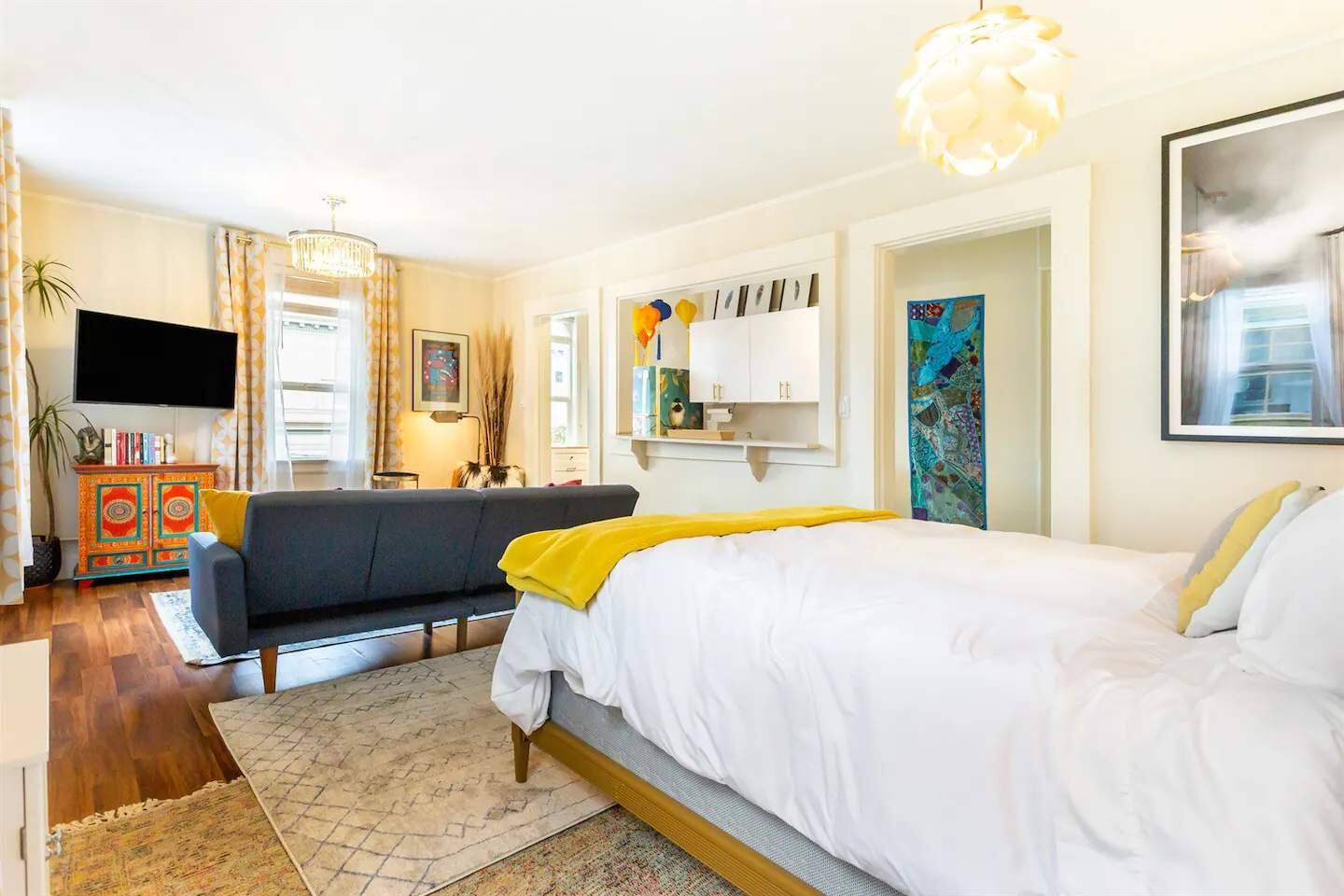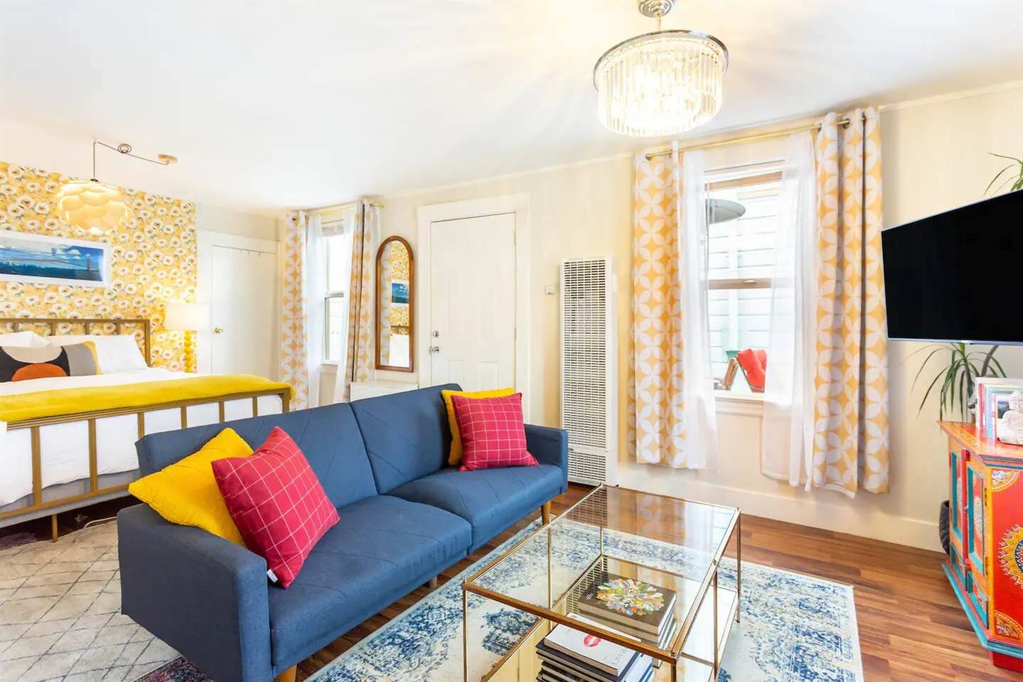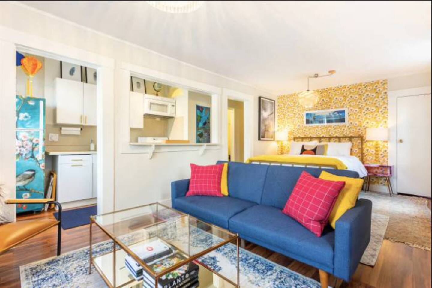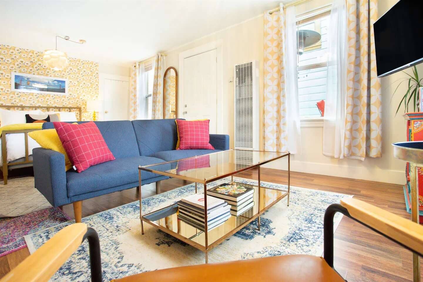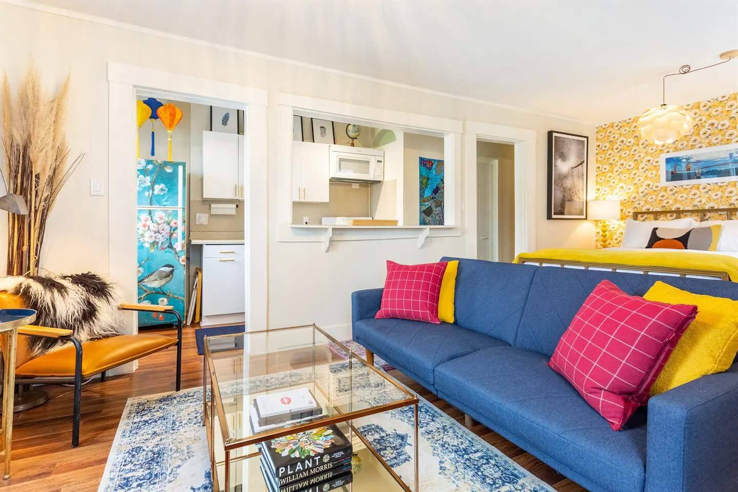 Welcome to Sutro Studio, this charming unit will inspire creatives with it's vibrant and professionally designed interior! Perfect for locals on stay-cation, vacationers, & long-term tenants. Located in Noe Valley, it's a short walk to Whole Foods, cafes, & restaurants. It offers a cozy stay with a queen bed, sofa bed, full bathroom, coffee nook, kitchen essentials, smart TV, & laundry access. Sutro is made w/ traveler convenience in mind, so you can enjoy a comfortable home away from home.